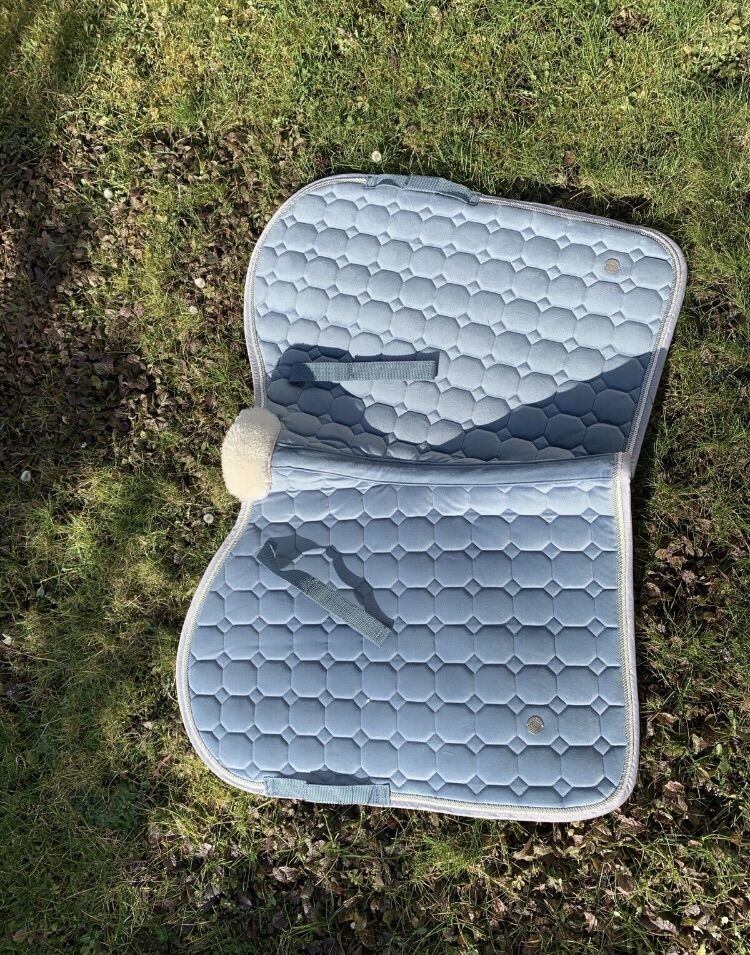 Nieuw zadeldek van Felix Bühler - Hier is mijn nieuwe zadeldek van Felix Bühler in een fluwelen look in lichtblauw in maat Pony.De originele prijs was 49,99€.Het is nooit op het paard gelegd en heeft verder geen gebruikssporen.Dus als nieuw!