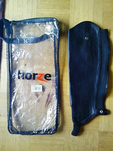 Nieuwe leren chaps HORZE zwart maat M volwassenen H44/W34 - Nieuwe echt leren chaps van zacht rundleer met een dressuurstrik, deze chaps van hoge kwaliteit hebben een perfecte pasvorm! Hoogte binnenkant 44 cm, buitenkant 47 cm, breedte onbelast 34 cm. De chaps zijn gemaakt van dik, zacht leer met een geborstelde leren voering en hebben een getailleerde pasvorm. De achterkant heeft een YKK rits en een stretch inzetstuk voor bewegingsvrijheid en comfort. Ongedragen nieuwstaat met bijpassende tas. Merk Horze, maat M, volwassenen Zie de foto's voor gedetailleerde afmetingen. Rookvrij huishouden, particuliere verkoop, Paypal beschikbaar. Nieuwprijs was 89,90 Euro.