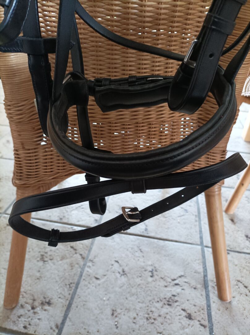 Nieuwe pony-snaarriem - Te koop hier is een compleet nieuw en ongebruikt ponyhoofdstel dat een stenen bies heeft op de frontriem, het hoofdstel heeft teugels maar geen bit helaas kan ik het label niet meer vinden dus ik weet helaas niet meer van welke fabrikant het is. Als je vragen hebt neem dan contact met me op