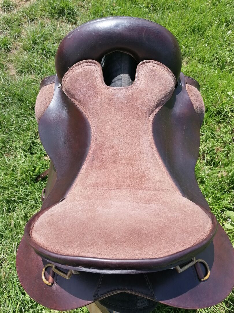 Het zadel is gebruikt en heeft normale gebruikssporen, maar is zeer goed verzorgd. De zitting en de pommels zijn van suède en verkeren eveneens in goede staat. De brede met leer beklede vork is van kunststof en er zit een los onderdeel in, maar dat heeft geen invloed op de functie.