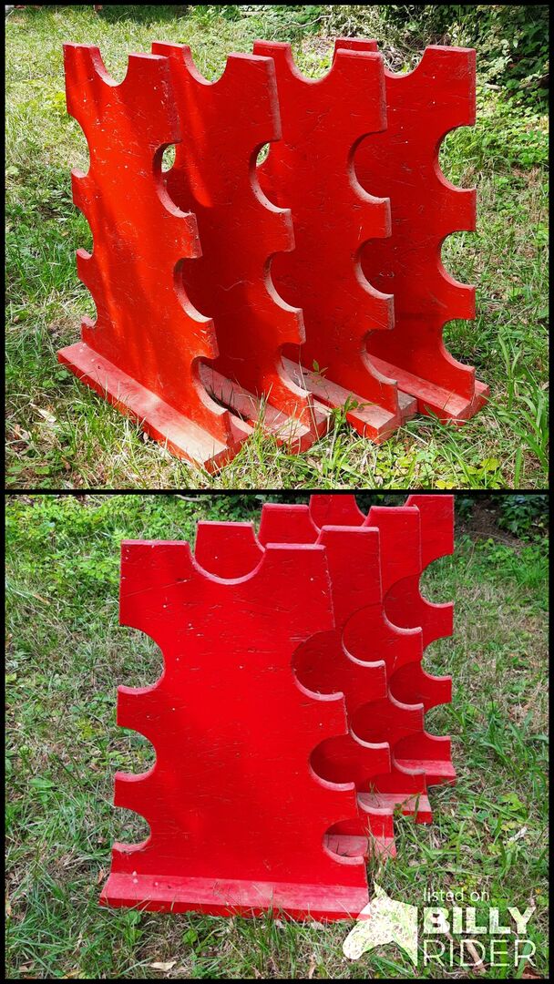 Obstakel stand/Cavaletti stand - Verkopen 2 paar houten hindernis/cavaletti statieven, maar nog steeds niet zwaar - hoogte 65 cm, breedte onder 50 cm, boven 28 cm - veelzijdig te gebruiken - zijn zeer weinig gebruikt wegens blessure, al enkele jaren droog opgeslagen in tuinhuis - worden samen of per paar verkocht, prijs per paar.