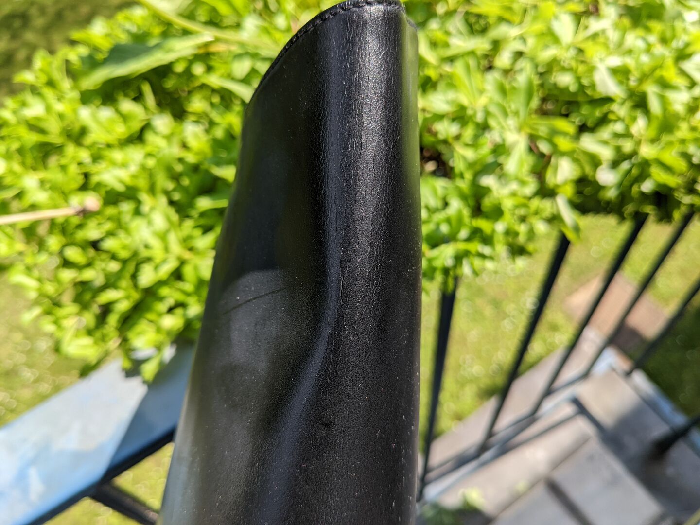 Door opslag op de linkerlaars een dun scheurtje op het leren oppervlak aan de voorkant, op de rechterlaars aan de voorkant bovenaan en ook verder naar beneden (zie foto's).