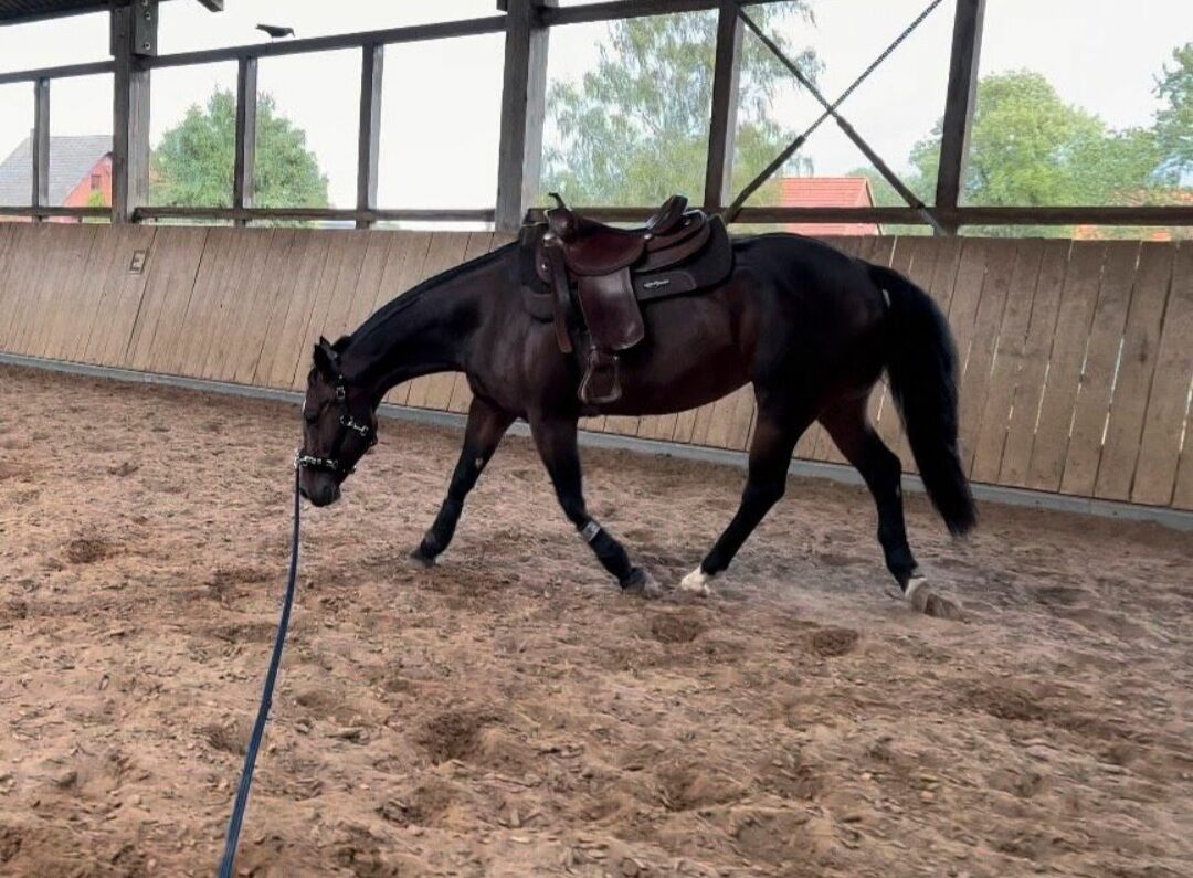 ongebruikte, knuffelbare Quarter Horse merrie - Ginie zoekt een 5 sterren thuis waar ze verder ontwikkeld zal worden. Ze is geboren in 2012 en heeft een lengte van 155 cm. Met haar sterke bouw dekt ze ook grotere ruiters goed. De merrie heeft in het begin wat tijd nodig om samen met haar mens te groeien. Maar ze is dan ook een zeer knuffelige partner en probeert altijd haar ruiter te behagen. In de omgang is ze nogal gevoelig en reageert ze fijn op hulpmiddelen, dus niets voor grove automobilisten. Ongebruikt omdat ze laat werd ingereden. Genie is een paar maanden professioneel bereden en heeft een solide basis western training. Ze kan zonder problemen alleen of in een groep worden gereden en is onverschrokken. Ginie heeft die zekere go en is iets voor de ambitieuze ruiter of voor de sport. Aangezien ze 2 vlekken heeft die haar op geen enkele manier aantasten (röntgenfoto's beschikbaar), zal ze voor een gunstige prijs verkocht worden aan goede handen. Desgewenst kan ook het bijpassende zadel worden aangeschaft. To the seller's offerlaunch