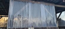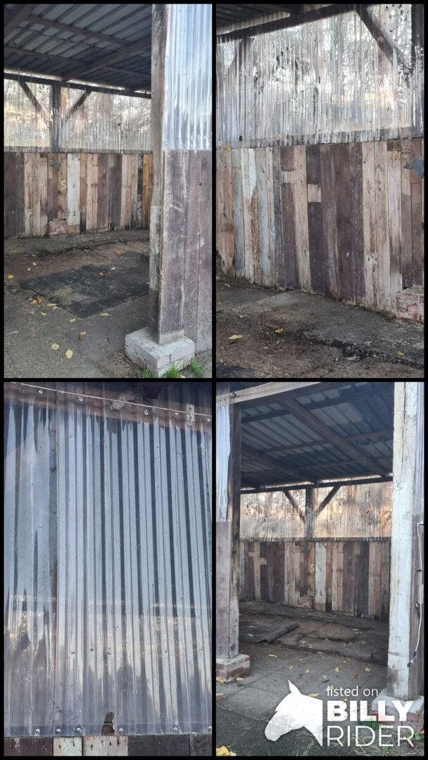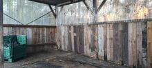 Open stal te koop voor ontmanteling - Grote open stal met dikke balken, houten spanten, trapeziumplaten en lichte panelen om zelf te demonteren te koop. de stal heeft een hoogte van ongeveer 3 meter en is ongeveer 6 meter lang en 3 meter breed.