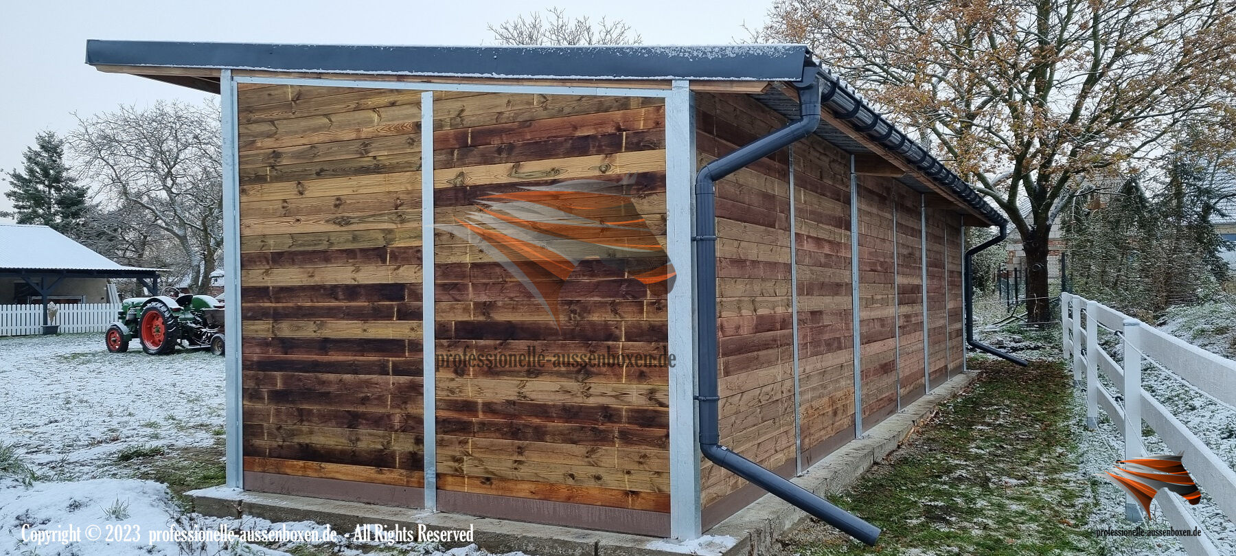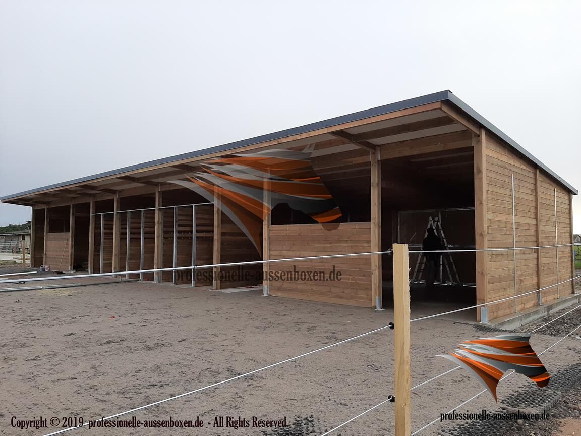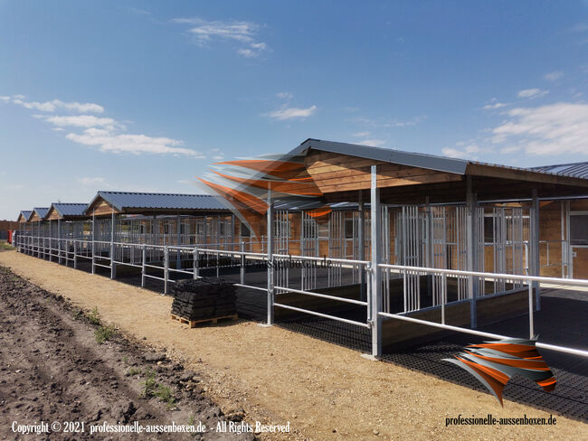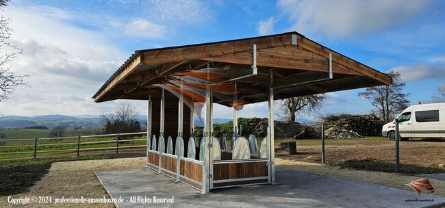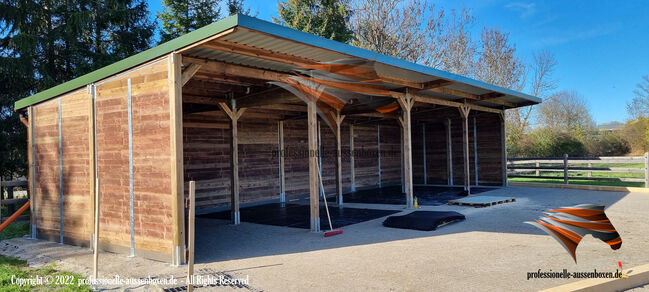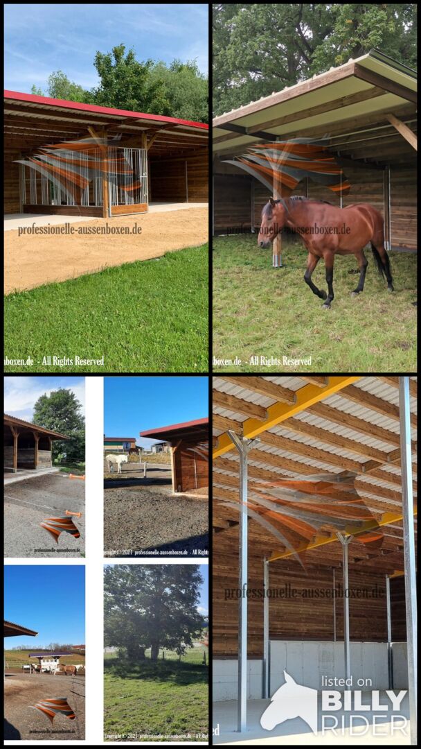 AUSSENBOXEN biedt hoogwaardige schuilplaatsen en overkappingen voor paarden, ideaal voor weiden, paddocks en voederplaatsen.