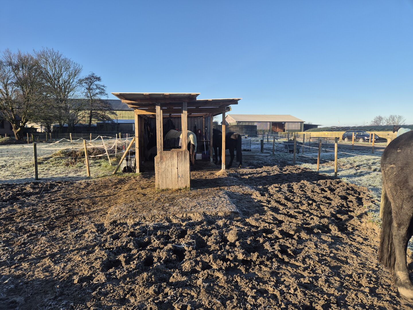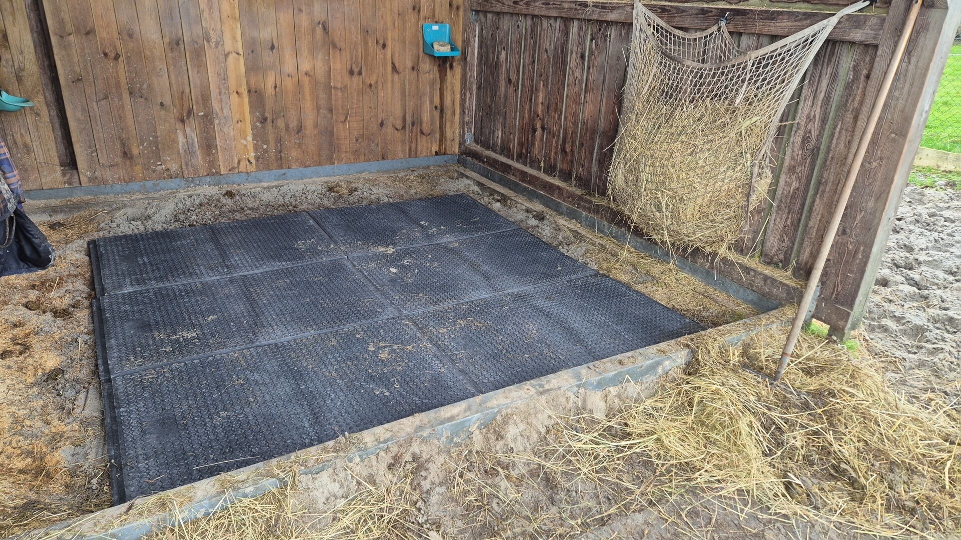Tijdens het weideseizoen hebben de paarden 3 hectare weiland tot hun beschikking met permanente toegang tot de open stal.