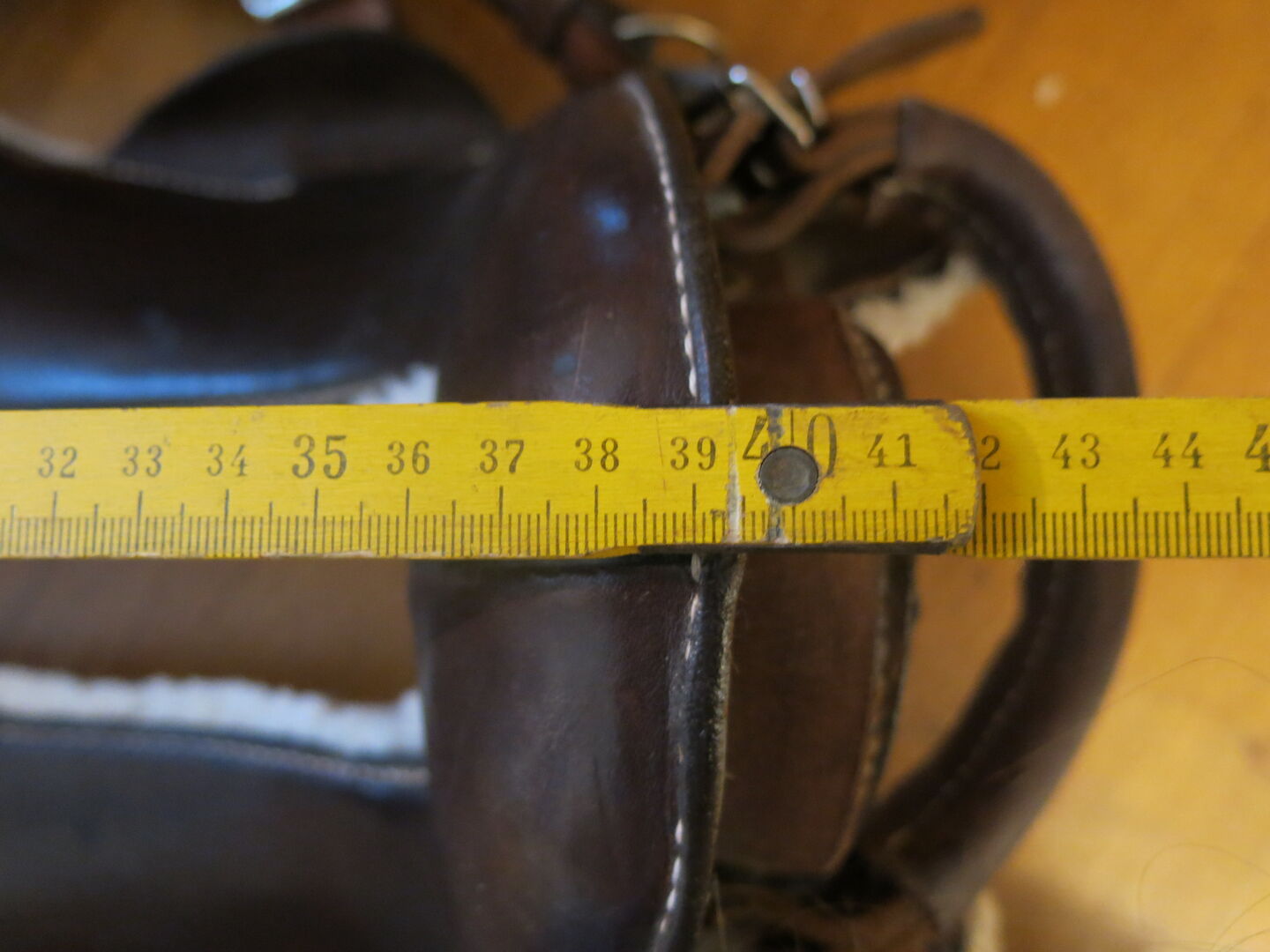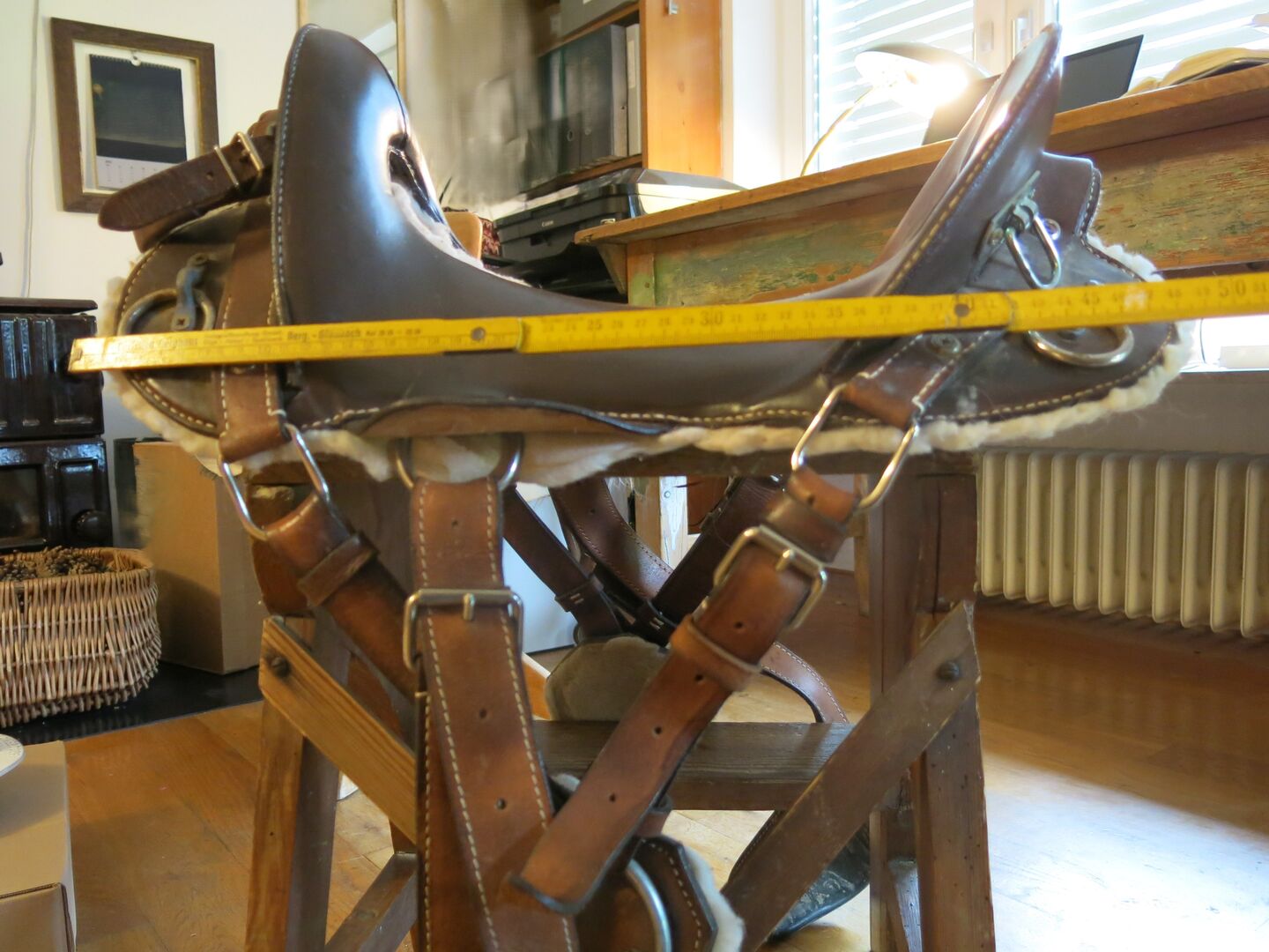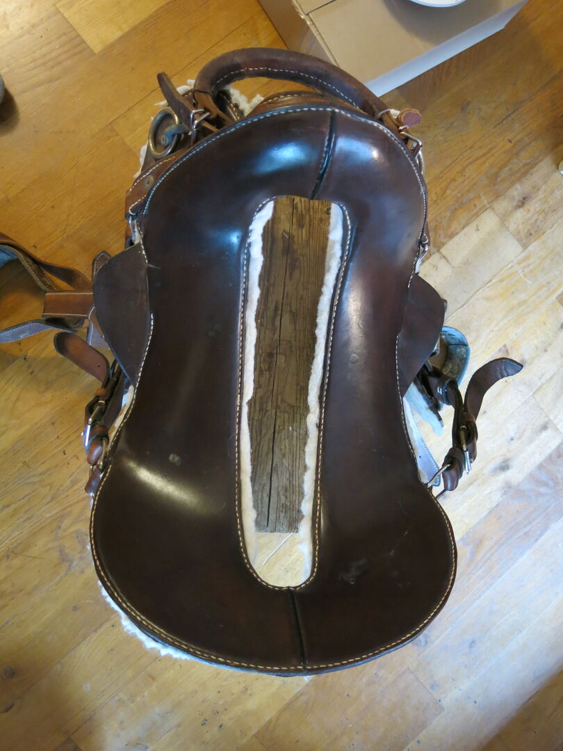 Hij is met leer bekleed en door zijn constructie (er zit een "gat" in het zadel) is hij licht, comfortabel en toch extreem stabiel. Het kan zowel als pakzadel en als rijzadel gebruikt worden. Afmetingen: zie foto's.