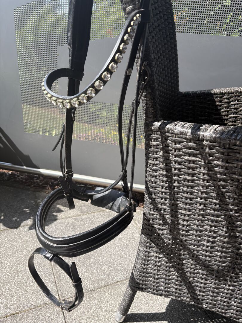 Otto Schumacher Snaffle voelt goed Warendorf - Een platgestikte snaffel Warendorf "Feel Good" van Otto Schumacher, met anatomisch gevormde Zweedse neusriem. De gebogen neusriem is versierd met Swarovski Rivoli XL 12 mm kristalsteentjes, gezet in zilver. Zeer goed gevoerde neusriem en kinriem in zwart. Het kopstuk van het hoofdstel is ook zacht gevoerd, typisch "Feel Good" model. De aankoopprijs van dit hoofdstel was €700. De factuur is beschikbaar. Het hoofdstel is maar kort gebruikt, max. 6 maanden, dus in topconditie.