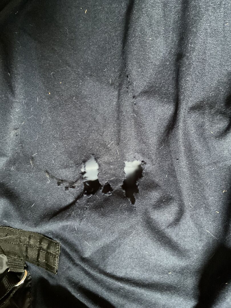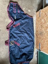 Overgangs regenhoes met fleece - Ik verkoop een overgangsdeken met fleece voering, die helaas op twee plaatsen gebroken is. De deken heeft nooit op een paard gelegen en is praktisch nieuw op deze twee gebroken plekken na.