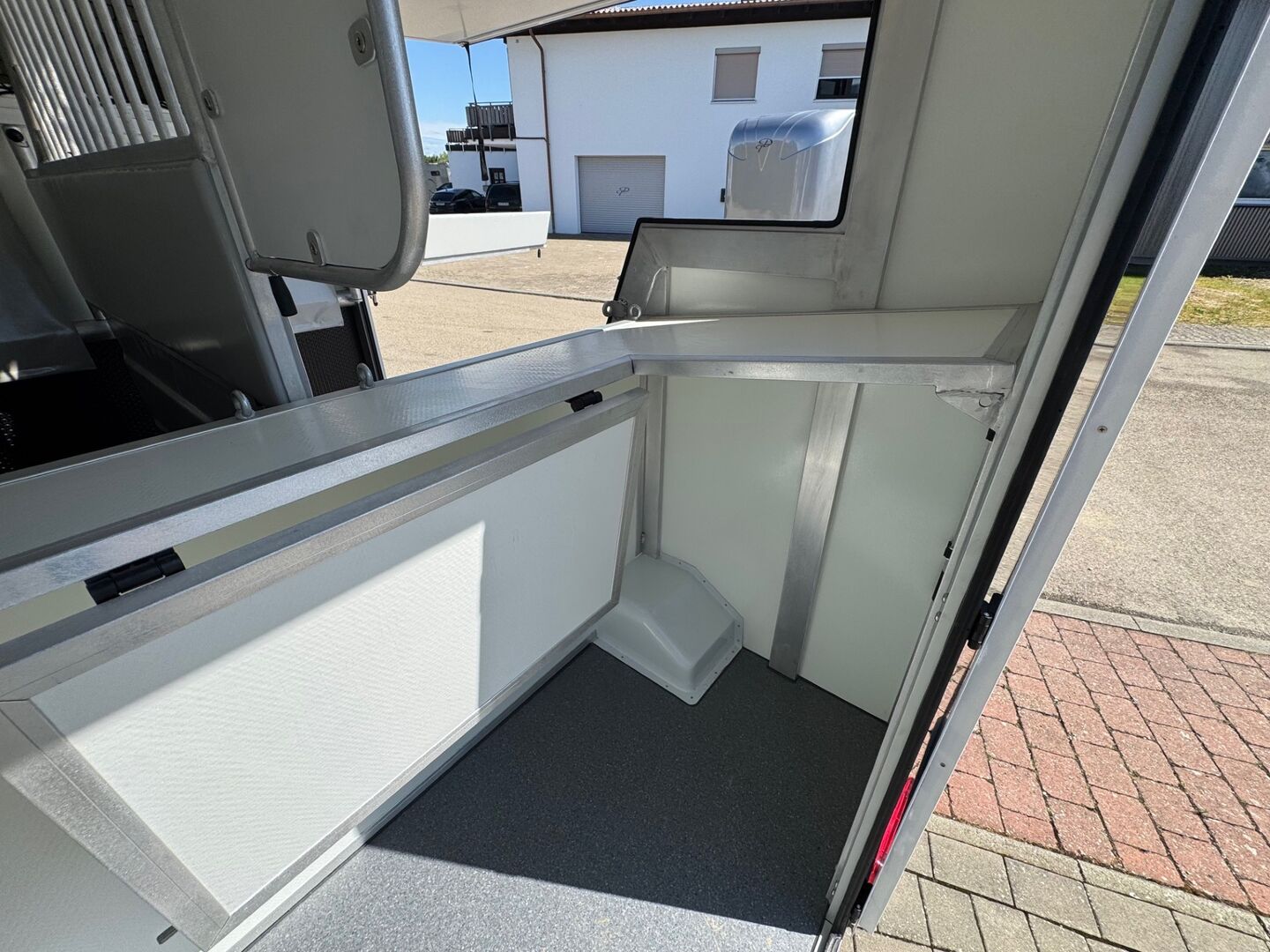 Het zadelbergvak is toegankelijk via de achterklep met behulp van een vouwsysteem. Hierdoor kun je de paarden voeren of hoofdstellen als de klep gesloten is. In de zadelkast zit rechts een opbergrek en links 2 zadel- en hoofdstelhouders.