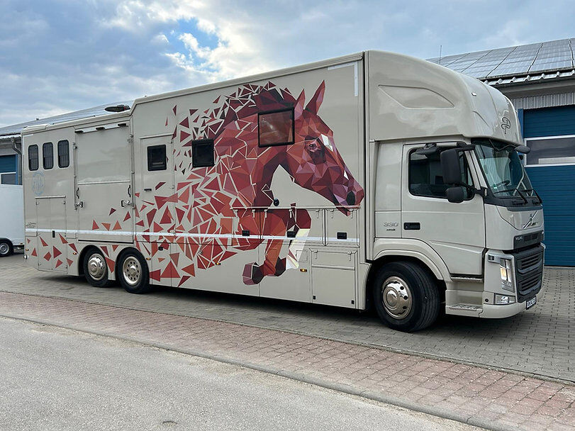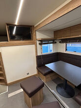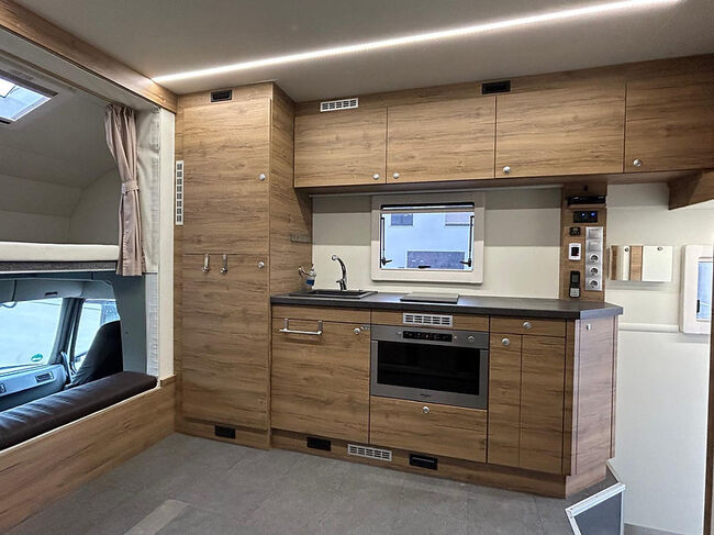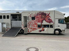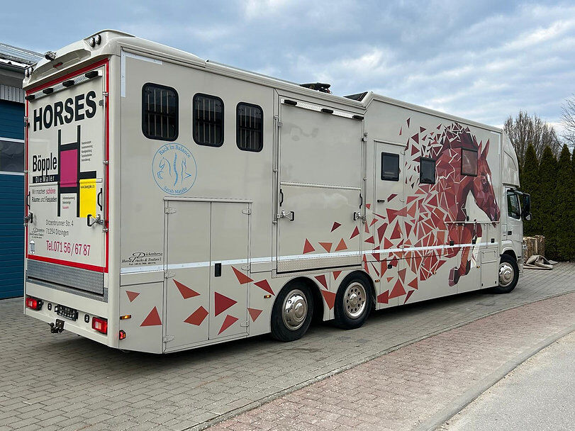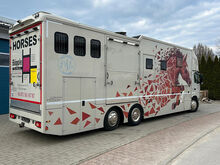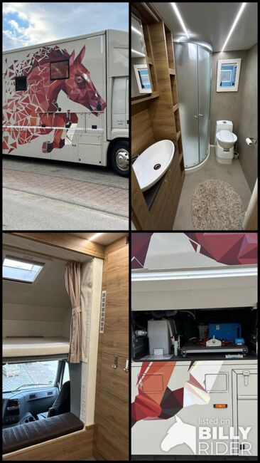 Paardenbox met camperrijbewijs (gratis) voor maximaal 5 paarden en woongedeelte met pop-out, zithoek met tafel om te bouwen tot slaapgedeelte, bed boven de badkamer, bed boven de bestuurderscabine in de topsleeper, 5-6 slaapplaatsen in totaal, keramische kookplaat, magnetron/oven, koelkast, kasten en wandkasten, badkamer met douche, toilet, wastafel