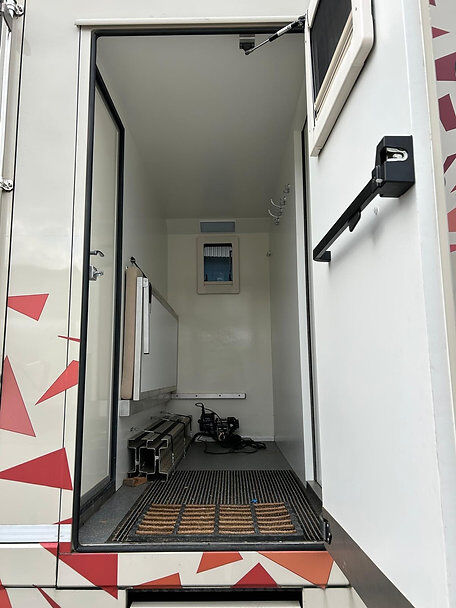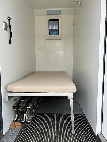 Aparte bergruimte bij de ingang, met opklapbaar ligbed, kabellier voor zadelkast, oprijplaten, extra brede toegangsdeur