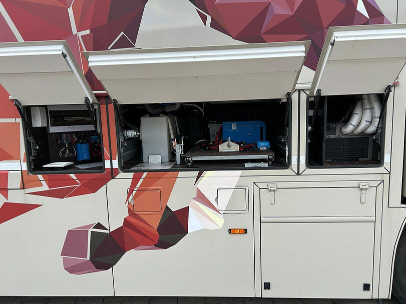 Elektrisch systeem met grote Victron spanningsomvormer, 4 krachtige accu's gemonteerd op uitschuifbare geleiders, zonnesysteem gemonteerd op het dak, opladen van de boordaccu's tijdens het rijden, opladen van de vrachtwagenaccu's wanneer aangesloten op het elektriciteitsnet