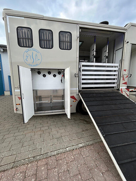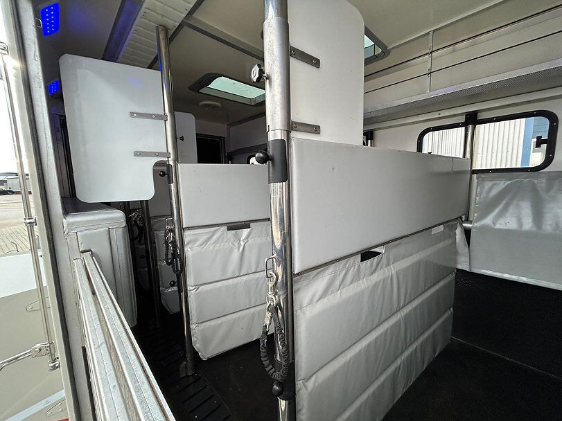 5 paardenboxen, achter- en zijhellingen met hellingbegrenzers, roestvrijstalen scheidingswanden, videobewaking, dakluiken, elektrische ventilator, nachtrijverlichting, verplaatsbare gestoffeerde scheidingswanden met opklapbare bijtbescherming, dekenrek boven het kruis van de paarden