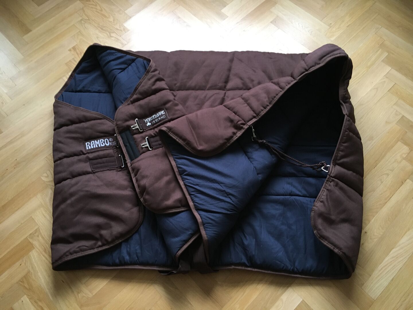 Paardendeken 130/135 cm 400 g nieuw - Ongebruikte deken van Rambo Horseware Ireland in bruin, met blauwe voering en kruisriemen, ruglengte 130 cm, maar valt iets groter uit.