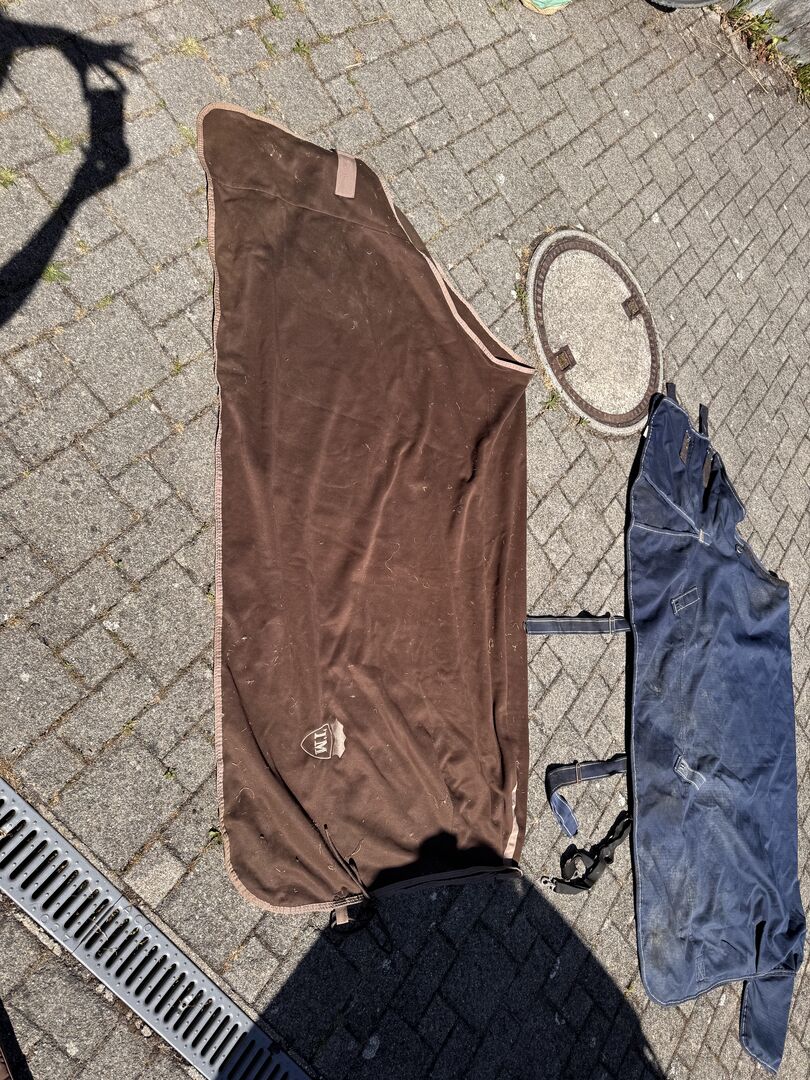Paardendekens - Te koop, zweetdeken 145cm bruin, is veel gebruikt. Regendeken met fleece 145 . Zit nog strak . Beide worden niet gewassen voor verkoop.