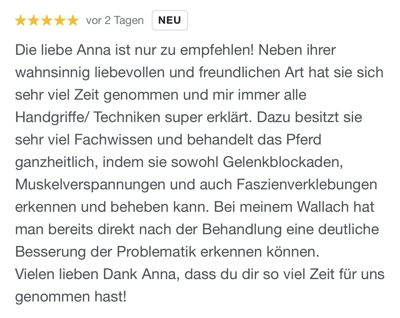 In de loop van mijn opleiding en mijn eerdere ervaring met mijn klantenpaarden heb ik al verschillende moeilijkheden en problemen kunnen oplossen. Zelfs probleempaarden en zeer gevoelige paarden zijn geen probleem, omdat met empathie, gevoeligheid en kalmte veel bereikt kan worden. Ik werk ook elk jaar in de VS op de Hidden Valley Ranch in Boise, Idaho, waar ik de kans krijg om paarden internationaal te behandelen en als paardenfysiotherapeut te werken op de Western Idaho Fair.