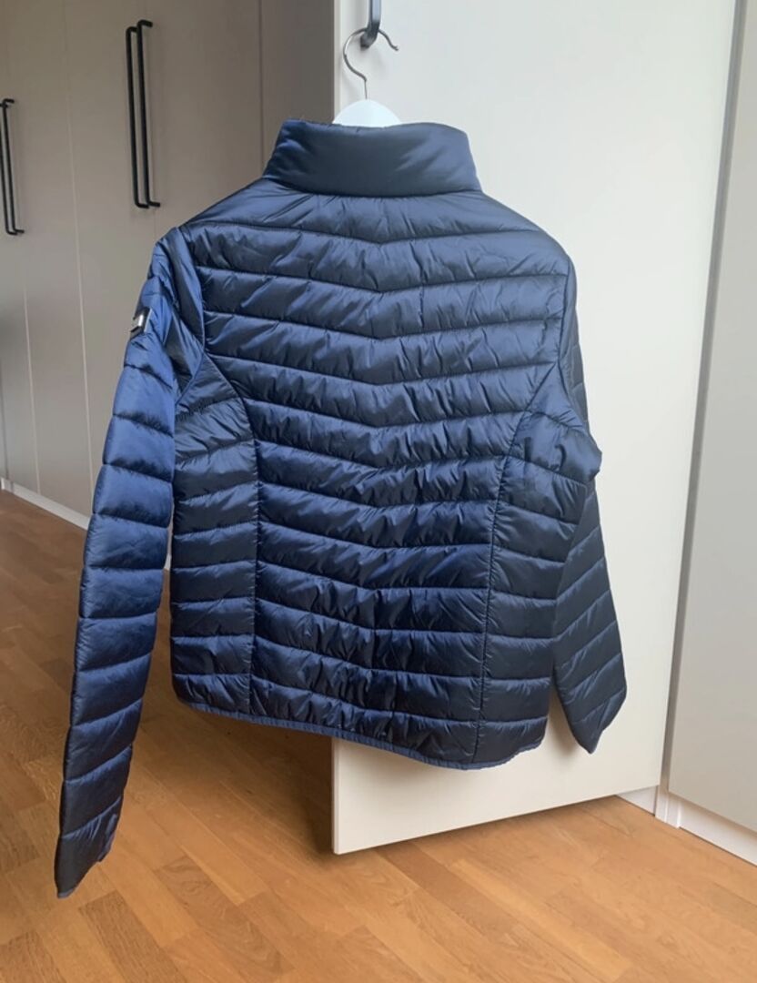 Elegant ontwerp ontmoet praktische details Met zijn diepe, donkere marineblauwe kleur en chroomkleurige accenten maakt de jas een modestatement waarmee je in elke situatie opvalt. De zilverkleurige ritsen met spiegelende afwerking en het gegraveerde Equestrian Stockholm logo geven de jas een exclusieve uitstraling. Dankzij de lichtgewicht materialen geniet je van maximale bewegingsvrijheid zonder in te leveren op comfort.