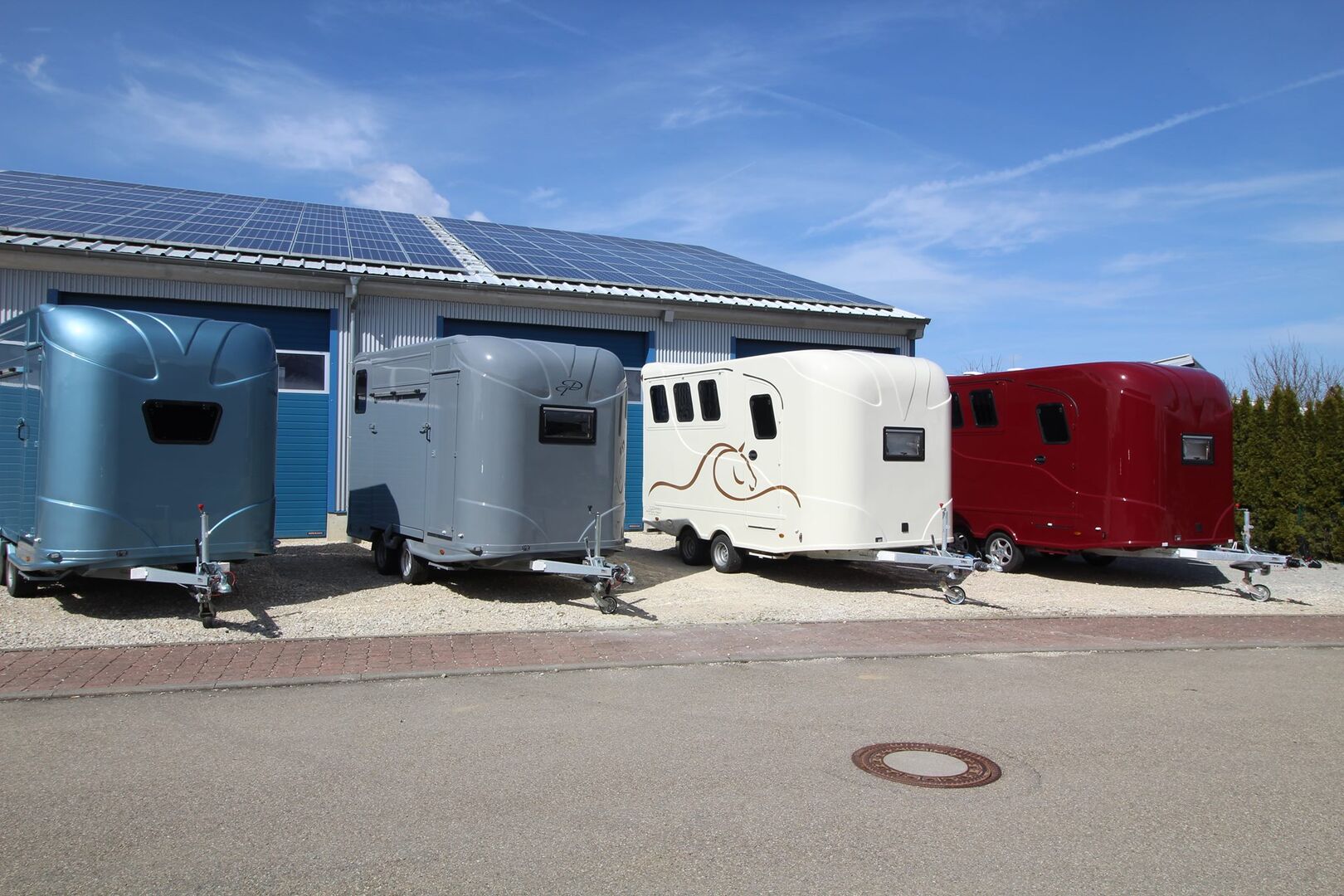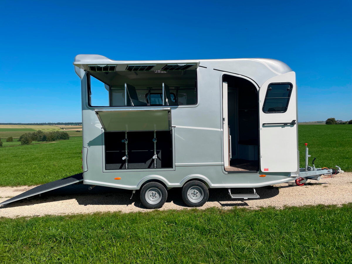 Ze zijn uitgerust met een leefruimte of ruime, inloopbare zadelkamer en bieden veel comfort op concours of op reis. Onze aanhangwagens voor het transport van 2 of 3 paarden