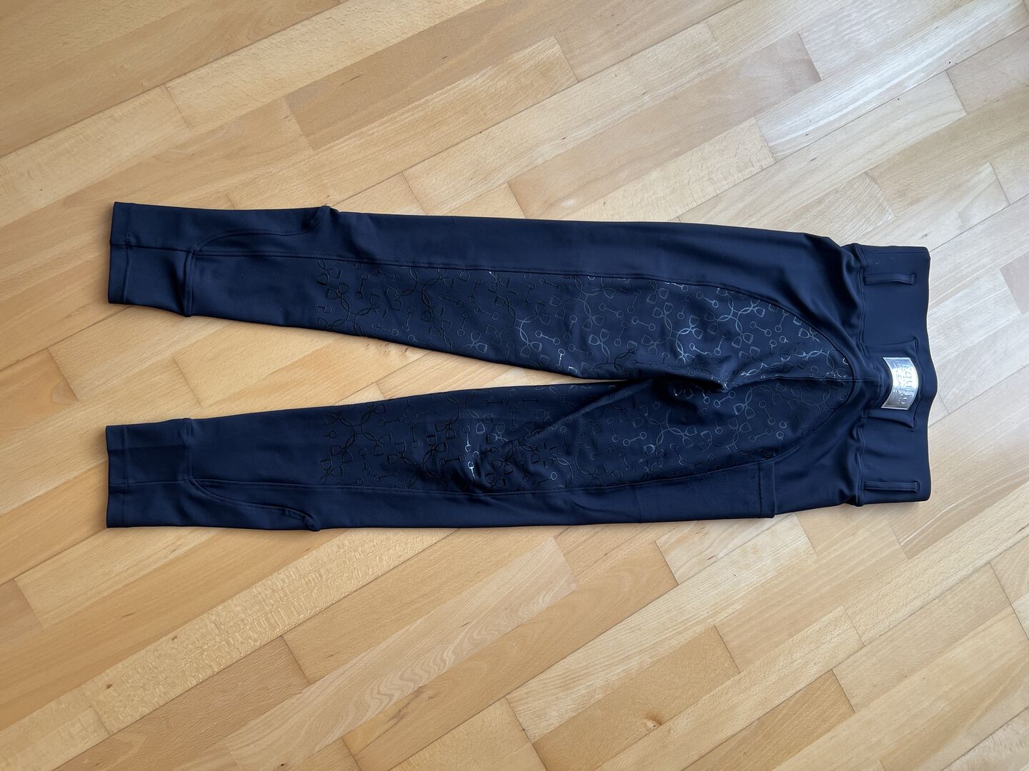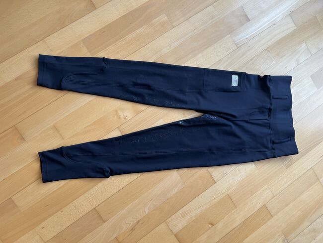 Ik verkoop deze paardrijlegging Full Grip van Equito Equestrian in zwart/zilver met gsm-zakje op het rechterbeen en kleine zilveren details. Synthetische full grip en elastische tailleband met riemlussen.