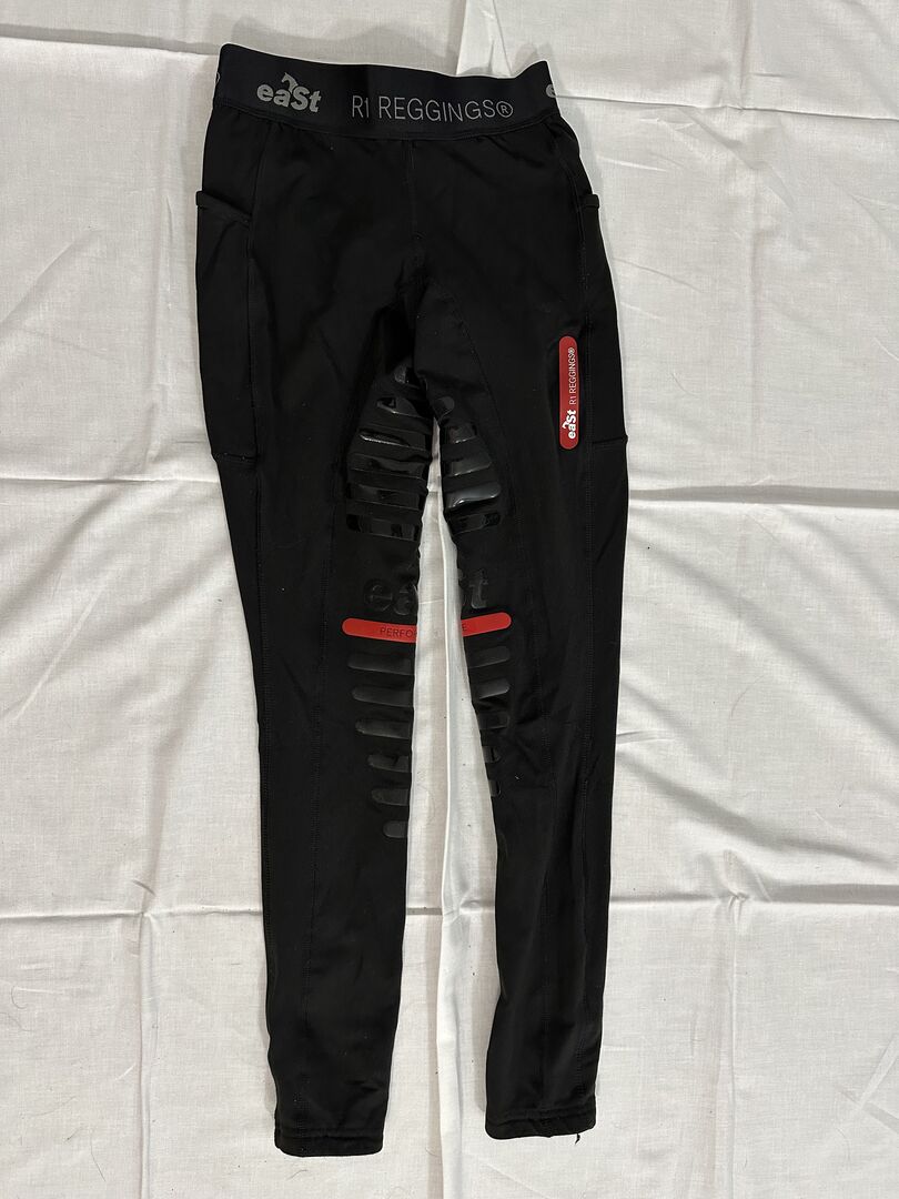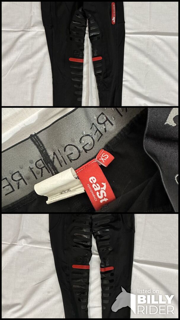 Paardrij legging zwart XS East - Rij legging van East in zwart met rode details in XS. Met siliconen halfzitting, gsm-zakken op beide benen en antisliptape op de enkels. Slechts een paar keer gedragen.