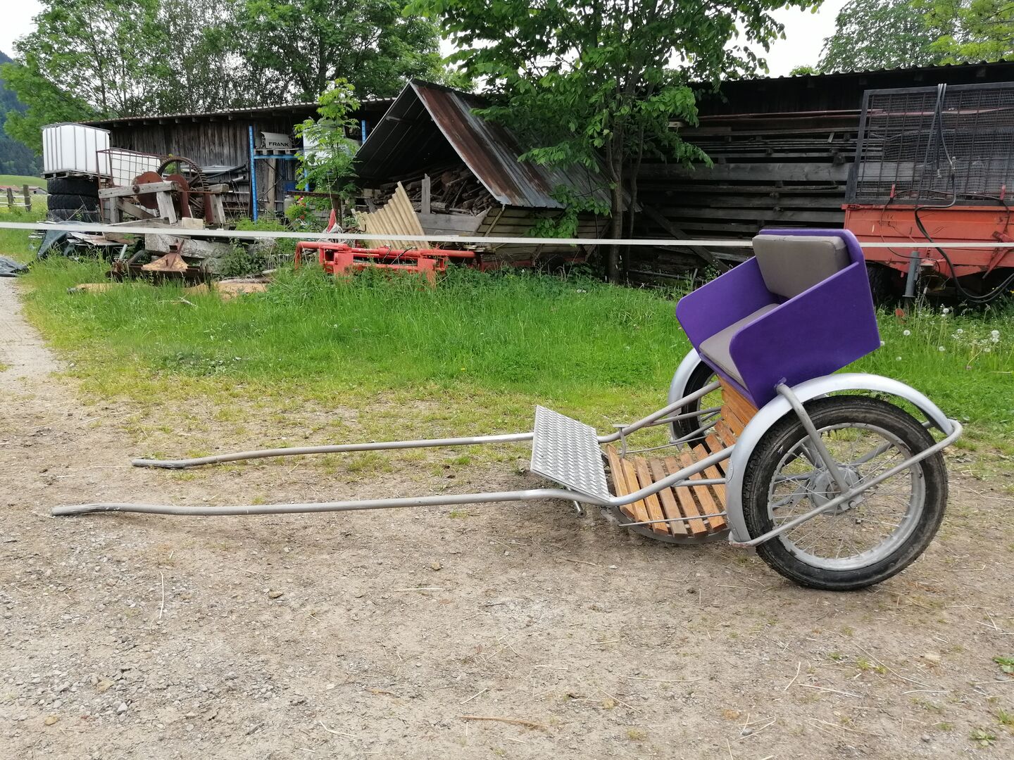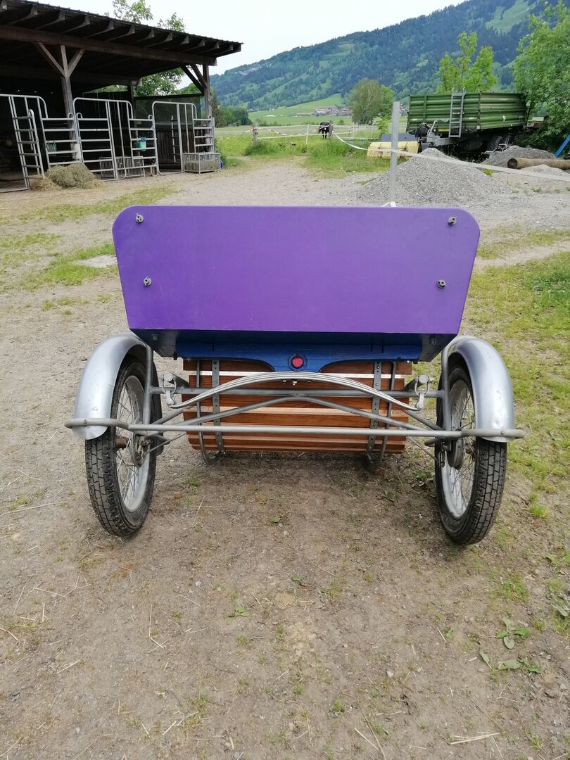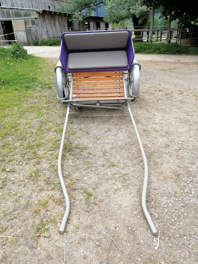 Paarse pony gig zoekt nieuw thuis - Ik verkoop mijn gebruikte Pony Gig. Deze is geschikt voor full-size paarden 1,35 m, de banden zijn nieuw. Met speelschaal en zacht zitkussen.