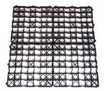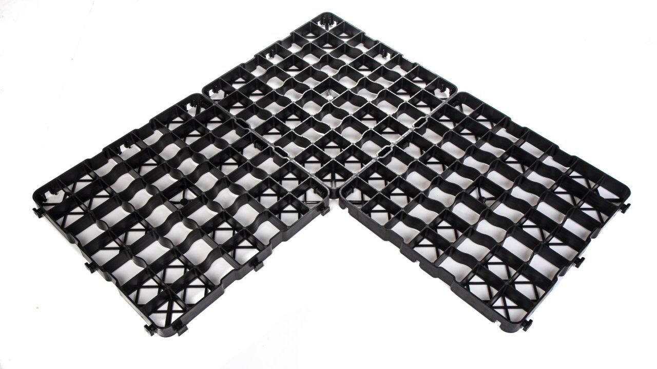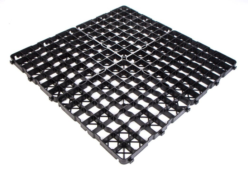 Clevergrid30-Art.0130 Prijs 11 € per m² (4 stuks opbrengst 1 m²) incl. BTW voor eigen afhaling Technische details: Afmeting 500 x 500 x 30 mm Gewicht ca. 3,80kg/m² Wanddikte buitenkader 4mm, binnenrooster 3mm Roostermaat 68 x 68mm Grondstof PE-LD/PE-HD geregenereerd materiaal Kleur zwart Bruikbaar oppervlak 4 stuks maken 1 m² indien gelegd Belasting 150 t/m² (laboratoriumwaarde)