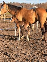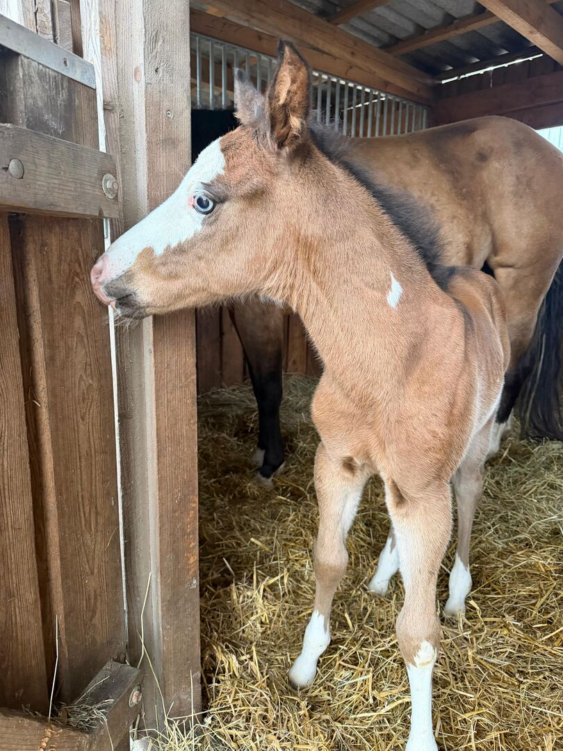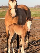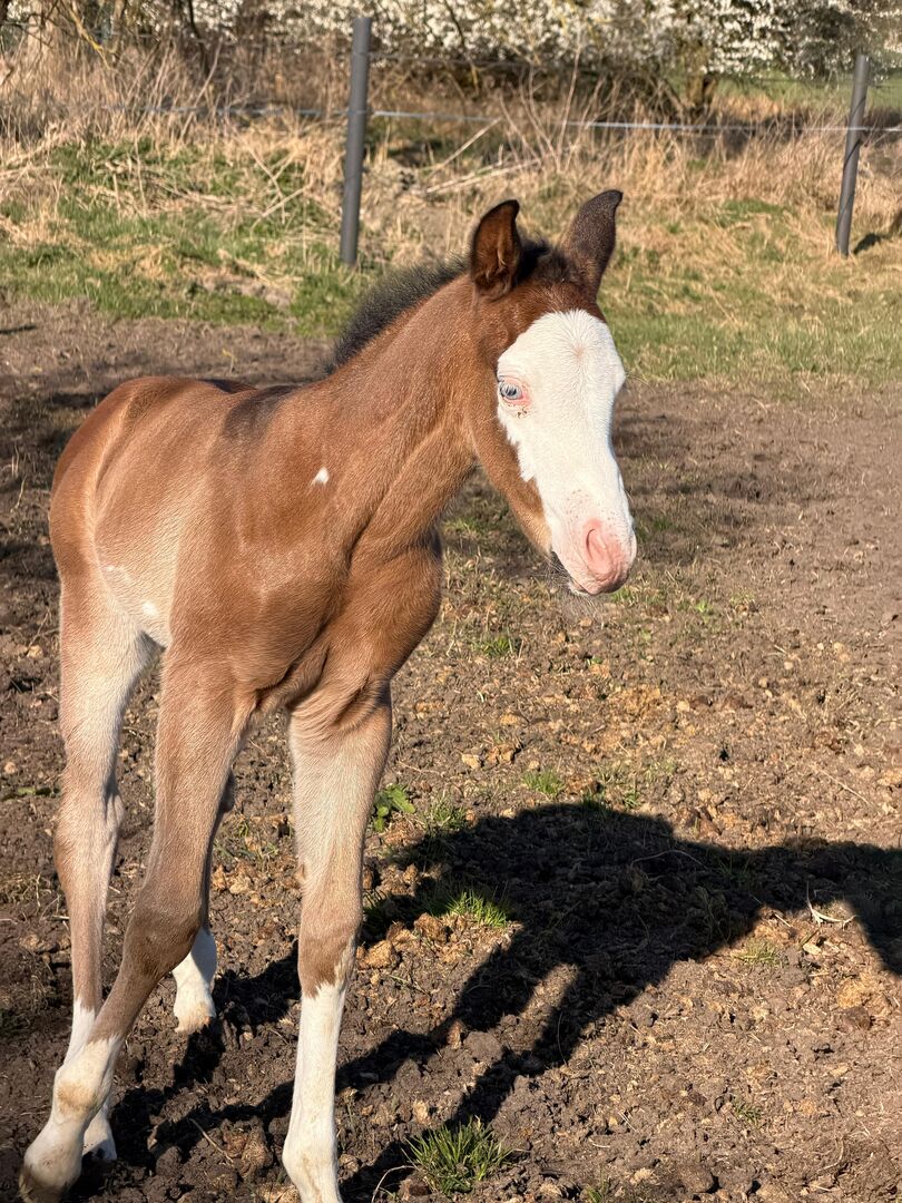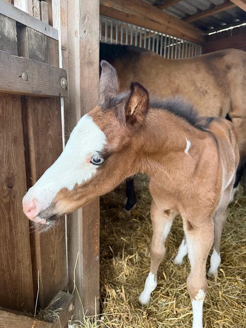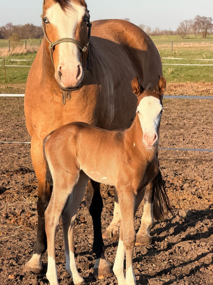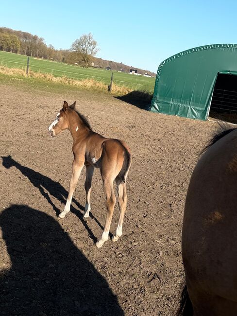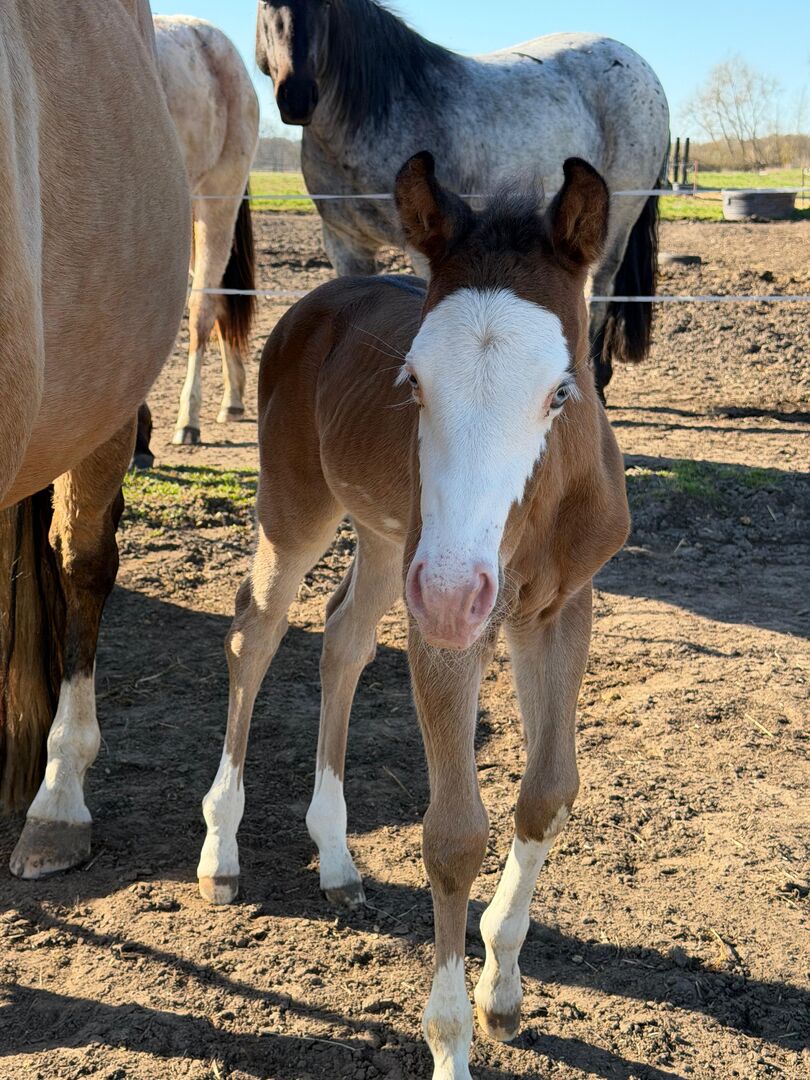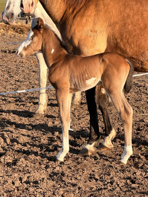Paint Horse veulen met uitzonderlijk charisma en veel potentieel - Plaats: 18182 Mönchhagen Hes A Diamond Chex is een kwaliteitsvolle Paint Horse hengst, geboren op 29.03.2026, in de uitzonderlijke kleur bay dun overo splash (kleurtest in uitvoering). Met een verwachte stokmaat van ca. 153 cm presenteert hij zich als een compacte, correct gebouwde en veelbelovende jonge hengst met goede verhoudingen en veel uitstraling. Dit veulen is niet alleen een absolute blikvanger, maar imponeert ook met zijn natuurlijke aanwezigheid en zijn ontspannen, elastische bewegingskwaliteit. Zijn interessante afstamming maakt hem bijzonder geschikt voor reining en allround rijden, maar hij is ook een opwindend vooruitzicht voor de ambitieuze vrijetijds- of wedstrijdruiter. Zijn karakter is uitzonderlijk mensgericht, vriendelijk en ongecompliceerd. Hij is nieuwsgierig, slim en tegelijkertijd kalm in nieuwe situaties. Typisch voor een veulen heeft hij een vrolijk, licht brutaal karakter, maar hij blijft altijd koel en heeft sterke zenuwen. Hij is al vertrouwd met omgevingsprikkels zoals landbouwmachines, auto's en alledaagse geluiden en accepteert ze volkomen ontspannen. Hes A Diamond Chex groeit op in een kudde met andere veulens en wordt grootgebracht volgens hoge normen. Hij krijgt leeftijdsgeschikt opfokvoer, wordt regelmatig ontwormd en heeft geen gezondheidsproblemen. De huidige 5-panels test is n/n. Hij wordt dagelijks consequent maar liefdevol behandeld. Hij kent de dierenarts en de hoefsmid al en begint te wennen aan het halster. Het veulen-ABC wordt voortdurend geconsolideerd. Hij weet ook hoe hij geladen moet worden en rijdt zonder problemen in een trailer. Zijn eerste uitstapjes in de natuur maken ook deel uit van zijn ontwikkeling. Dit Paint Horse veulen heeft de beste voorwaarden voor een toekomst in zowel de sport als in de hogere recreatiesector. Zijn karakter, sterke zenuwen en natuurlijke coolness maken hem interessant voor ambitieuze wedstrijdruiters en voor eigenaren van recreatie- en familiepaarden.