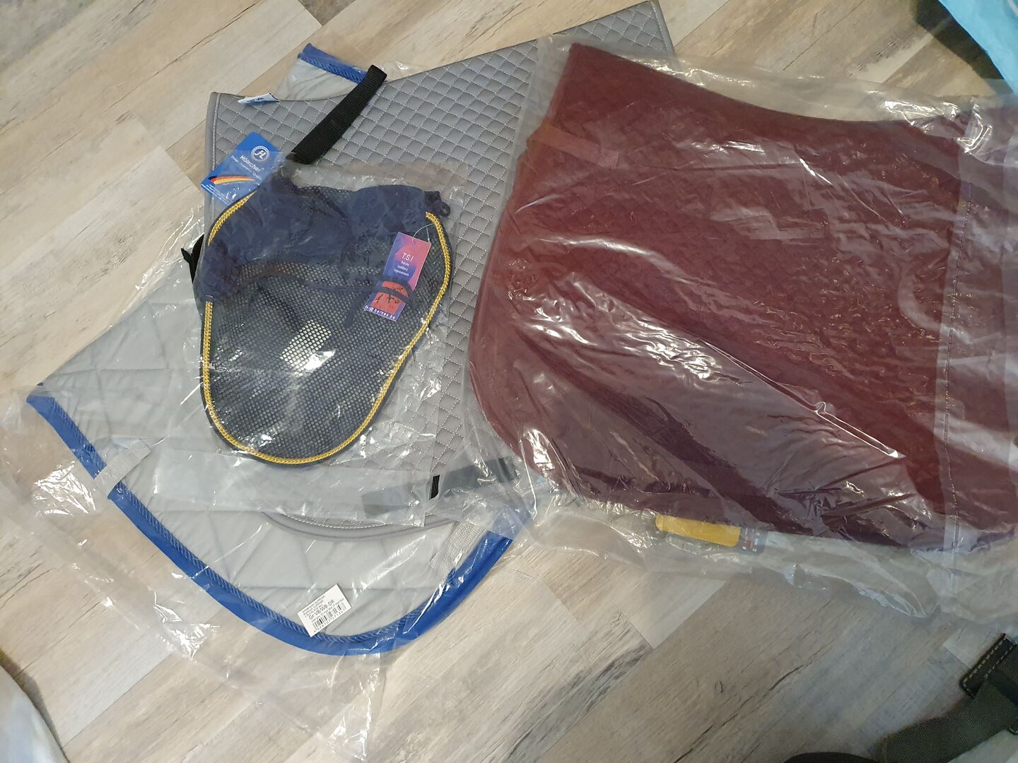 Pakket voor ruiters, 3 nieuwe zadeldekjes en 1 vliegenmuts - Hallo allemaal. Ik bied 3 nieuwe zadeldekjes aan in een pakket, allemaal voor dressuurzadels in de maat WB. Daarnaast een vliegenmuts van gaas, donkerblauw, ook nieuw.
