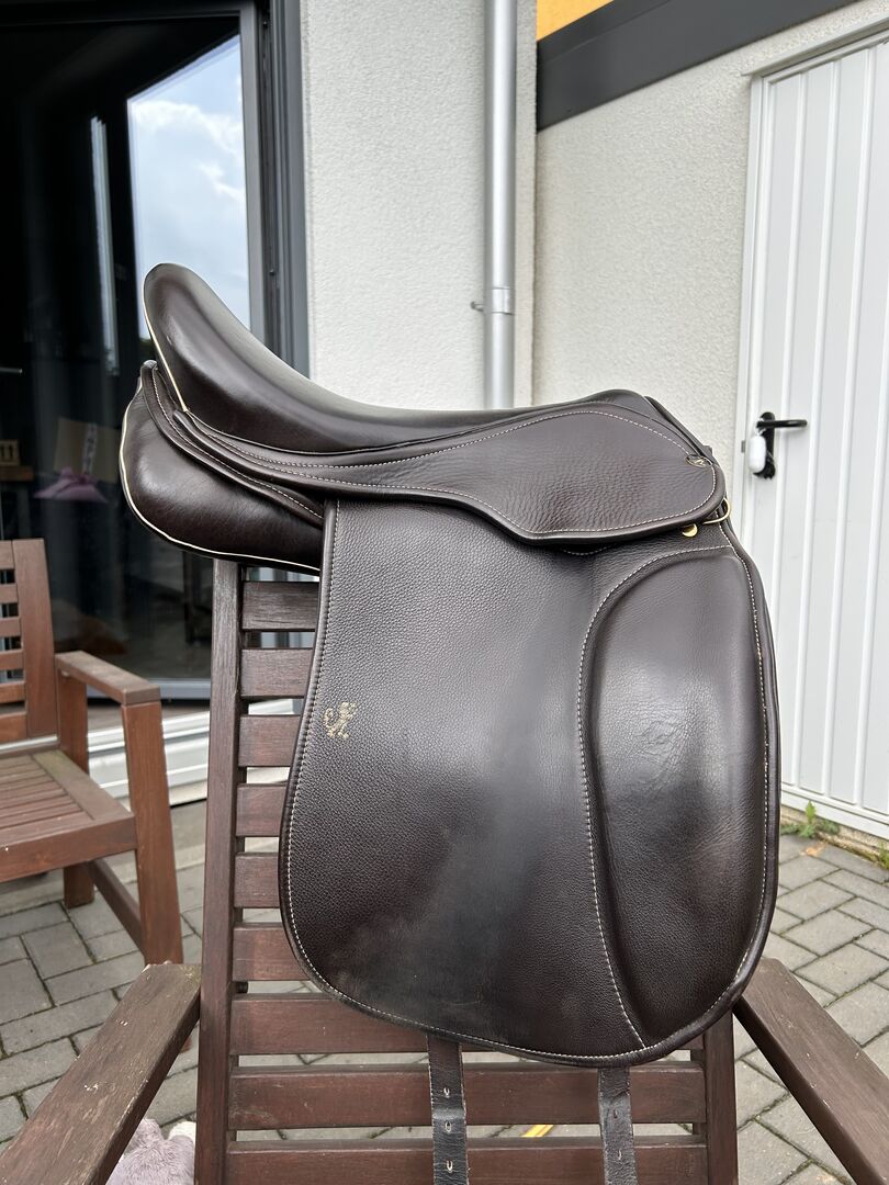 Palatina (Summer Basis) dressuurzadel superzacht! - Te koop aangeboden is een prachtig donkerbruin Palatina dressuurzadel. Helaas bestaat deze luxe zadelfabrikant niet meer. Palatina was een populair Duits bedrijf dat op maat gemaakte zadels van geweldige kwaliteit maakte. De kwaliteit van het leer is niet van deze wereld.