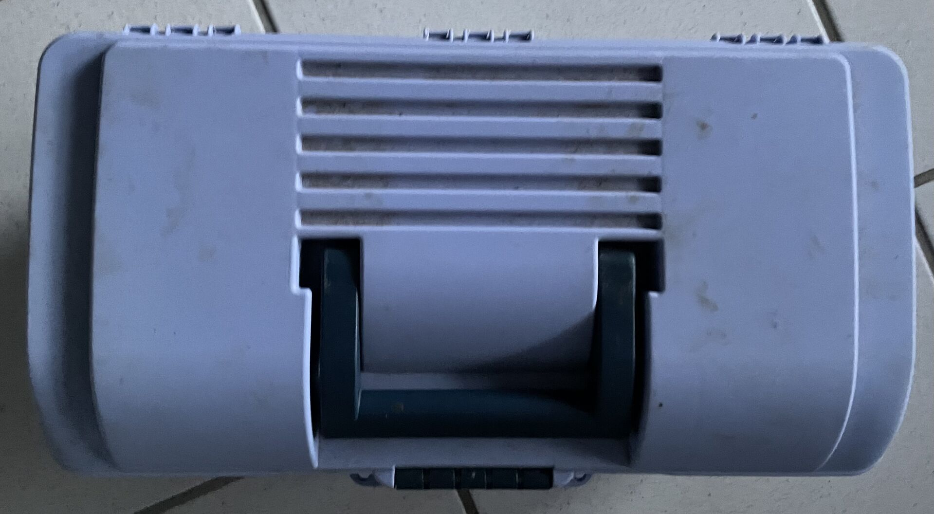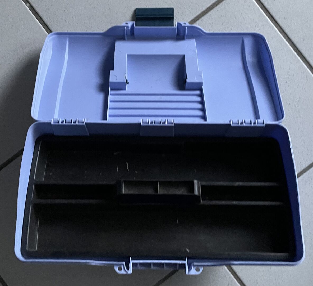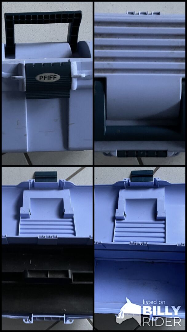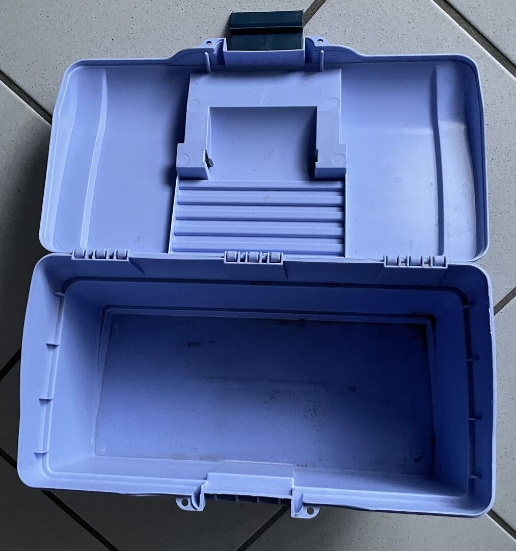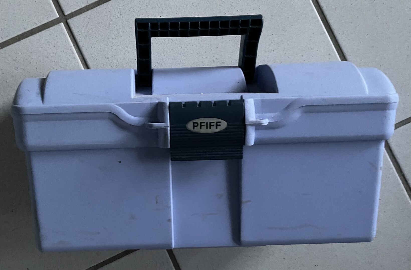 Pfiff Reinigingsdoos - Gebruikte poetsdoos in lichtblauw met donkerblauw handvat en zwarte inlage. Het is volledig in tact.