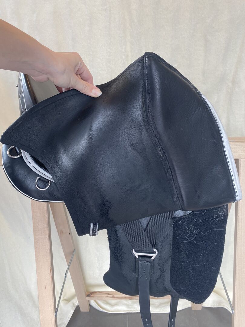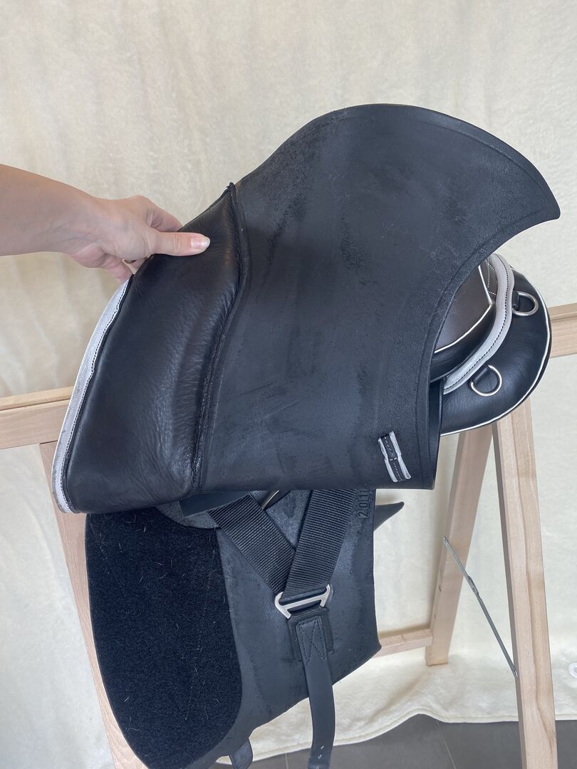 Philimar Eventing Zadel - Ik verkoop hier (alleen vanwege de overstap naar westernrijden) mijn Philimar eventingzadel, dat echter het liefst op dressuurzadeldekjes ligt. Het kan worden versteld met zeer comfortabele klittenbandpanelen en is daarom comfortabel voor dressuur, springen en cross-country. Hij is uitgerust met een comfortzitting, een stootrand en nog veel meer. De factuur kan desgewenst worden ingezien! Het is nu 4 jaar oud, maar aangezien ik ongeveer 2 jaar afwezig ben geweest wegens zwangerschappen en kinderopvang, en verder gemiddeld maar 1 keer per week op het paard zit, en ook nog een tweede zadel van Philimar heb, is het niet meer dan ongeveer 50 keer gebruikt. Ik heb hem regelmatig verzorgd en hij is altijd gedekt geweest, met de singel aan de beschermer, niet aan het zadel. De huidige foto's zijn niet bewerkt. De foto's van het zadel op het paard zijn van 2017.