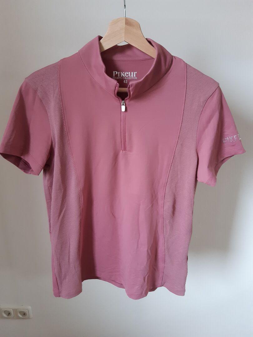 Pikeur shirt roos - Functioneel shirt/toernooishirt met korte mouwen van pikeur in edelroze, maat 42. Zoals altijd bij pikeur vallen de items meestal kleiner uit, dus het shirt valt losjes voor 38 en normaal voor 40 en 42. Met ritssluiting aan de voorkant en straslabels aan de achterkant. Nieuw en ongedragen. NP 79