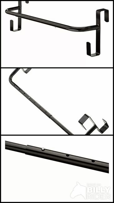 Plafondbevestiging - Plafondbeugel met variabele lengte. Kan eenvoudig voor de box worden gehangen. Geen ingewikkelde bevestiging nodig. Met 2 extra haken voor het ophangen van halsters, hoofdstellen etc. Verstelbare lengte van 60 tot 94 cm.