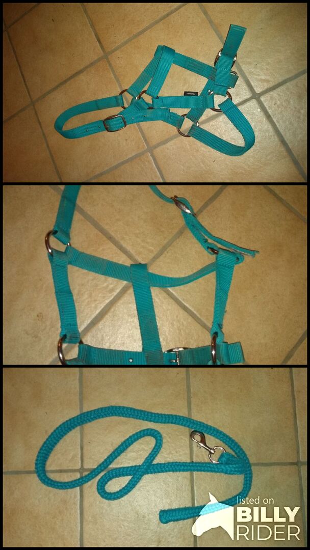 Ik verkoop hier een PONY HALFTER in maat pony met een turquoise touw beide zijn ongeveer 2 maanden gebruikt en nu kan ik het helaas niet meer aan iemand kwijt. Het is nog in goede staat!