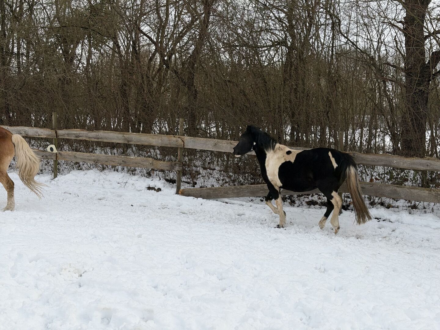 Ze kent open stallen/weiden en de dagelijkse omgang en is gewend aan honden (ook grotere honden, bijv. bulldogs). Ze heeft al een veulen gehad.