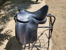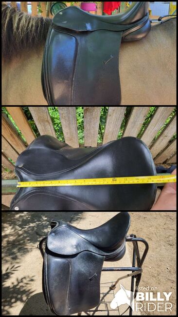 Ponyzadel voor korte ruggen - Mooi, goed onderhouden Claridge House 16,5 inch zadel. Schedelplaat verwisselbaar. Momenteel gemonteerd met de breedste slokdarmplaat (geel). Gepast op brede Haflinger en 135cm Welsh pony met kort contactoppervlak.