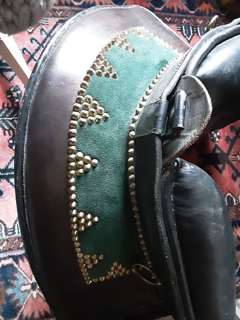 Portugees zadel - Goed geconserveerd, comfortabel zadel dat veiligheid uitstraalt, met bijpassende Zalea van lamsvel, zadelonderkant zwart leer, meer foto's op aanvraag
