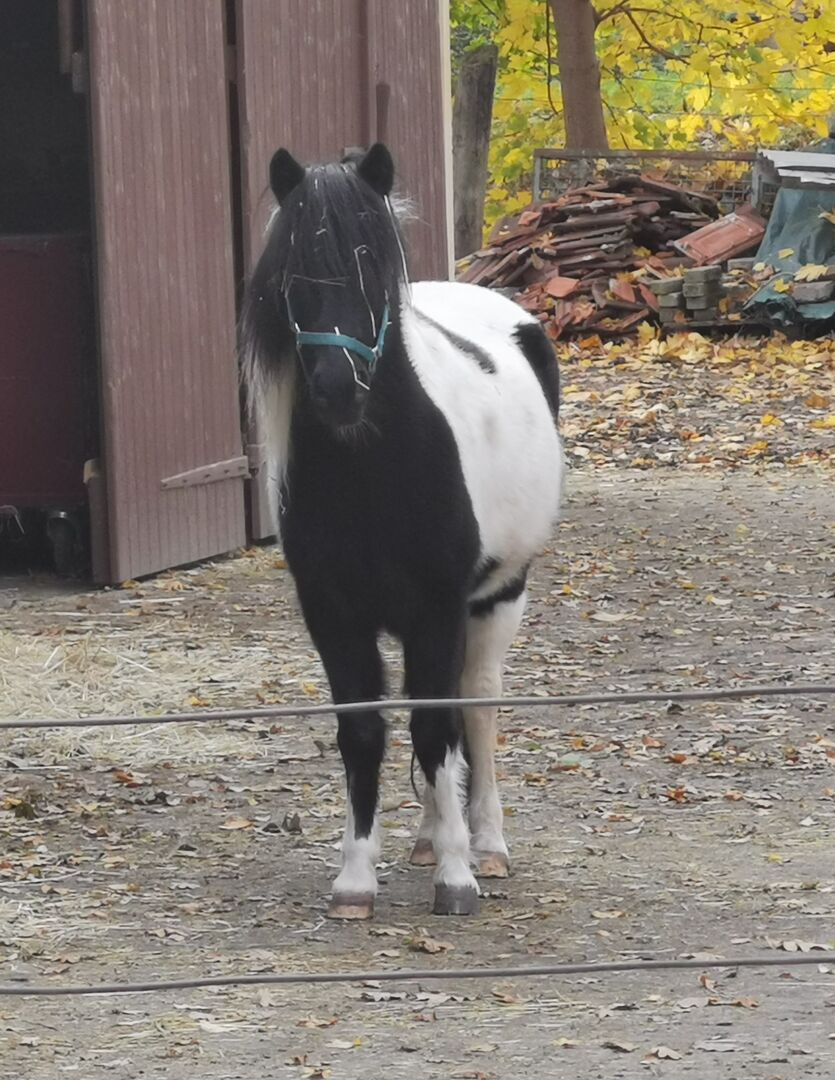 De zwart-witte pinto-merrie is twee jaar door onze 10-jarige dochter bereden. Ze heeft deelgenomen aan paardrijlessen en ponyspelletjes met haar gespeeld. Zwiebel loopt veilig alleen en in een groep in de wei. Zwiebel is ingereden en loopt volgens de vorige eigenaar goed voor de wagen. Dit hebben we nooit geprobeerd. Ze doet het goed op wandelingen, longeren, grooming en bij de hoefsmid. Soms heeft ze een typisch ponyhoofd. Zwiebel moet gereden worden door een kind met rijervaring. Ze is geen beginnerspony.