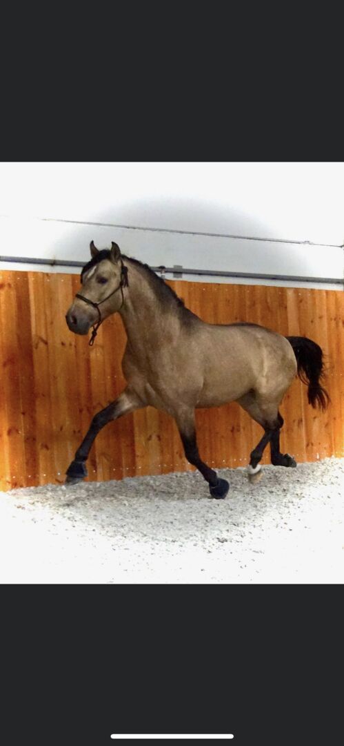 Das Fohlen ist CrPrl Sonderfarbe (Bayo Perla// Cream Pearl gen)- der Vater war unser Hengst Isabelo AFORTUNADO XL (prlprl) (Enkel von Sharpei de Narbon).