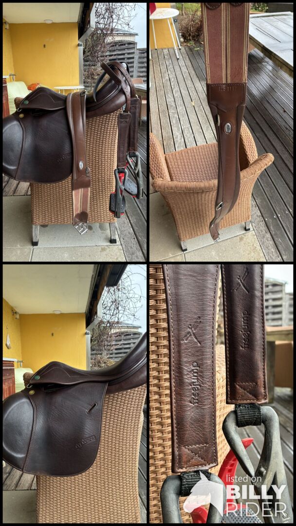 Prestige Joy Springzadel in Tabacco/Bruin + Freejump stijgbeugels met riemen - Ik ben bezig met de verkoop van mijn Prestige Joy springzadel in Tabacco/Bruin met originele Prestige singel + Freejump stijgbeugels met riemen.