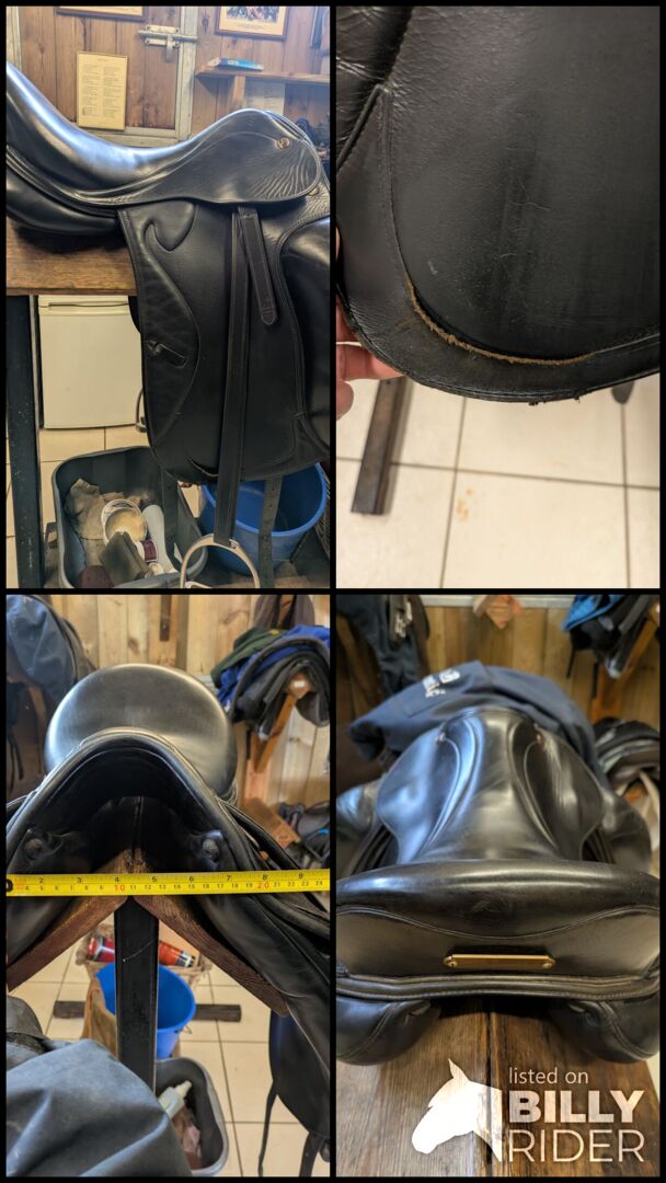 Lovely neat dressage saddle. 17" m/w. Sadly no longer needed on a 16.1 tb, suitable for similar type. Comfortable seat. Wool flocked so easily adjusted to fit and change as horses shape. Regularly maintained. Slight wear on leather at calf position.