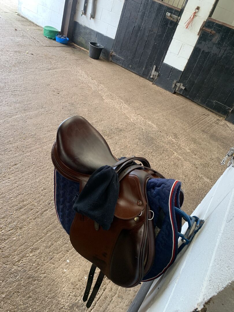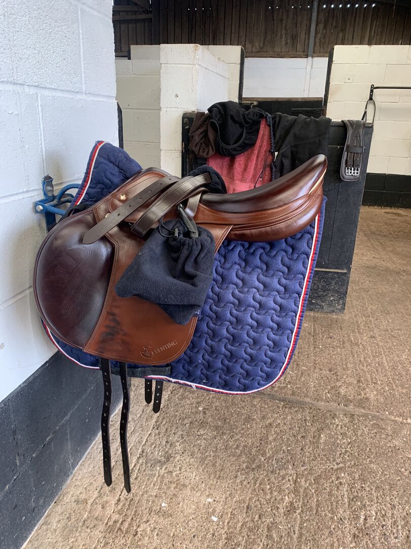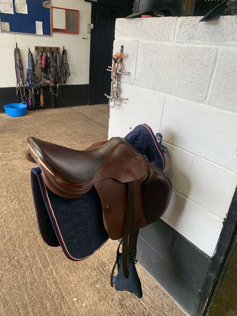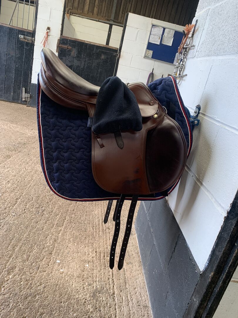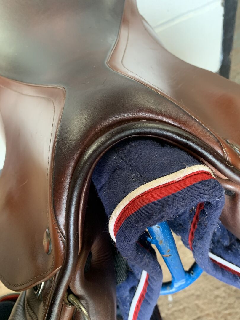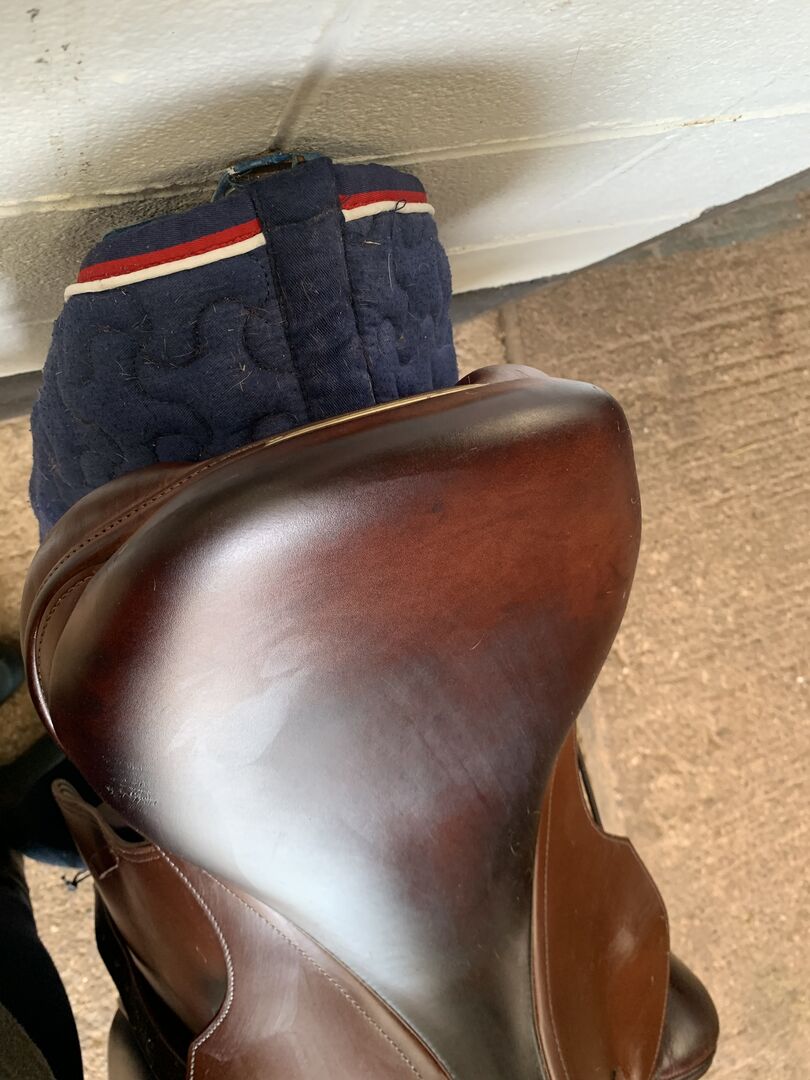 ( smears are from cleaning before pics ) 17.5 seat narrow fit no longer fits My horse it’s so comfy huge knee rolls and thigh blocks