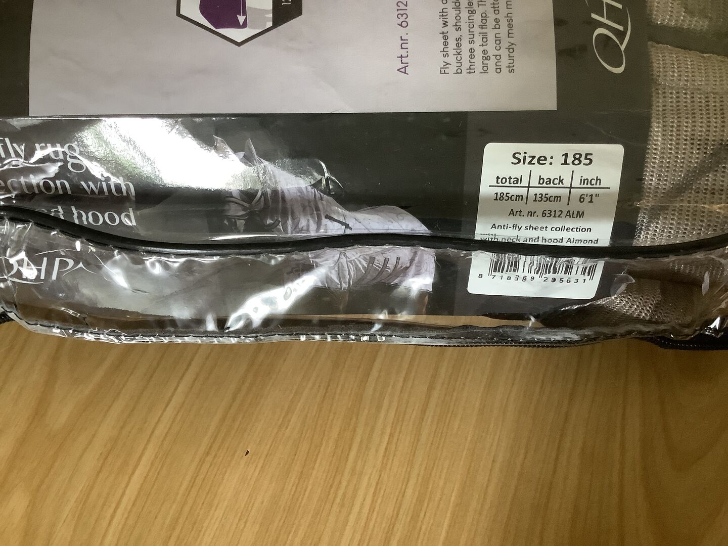 QHP vliegendeken nieuw 135 - Nieuwe vliegendeken (zat alleen op het paard om te passen) QHP met afneembaar halsgedeelte buik slab met 3 riemen, geverfd, staart slab in de kleur beige bruin met blauwe rand en beenkoorden Nieuwprijs 119 Fr.