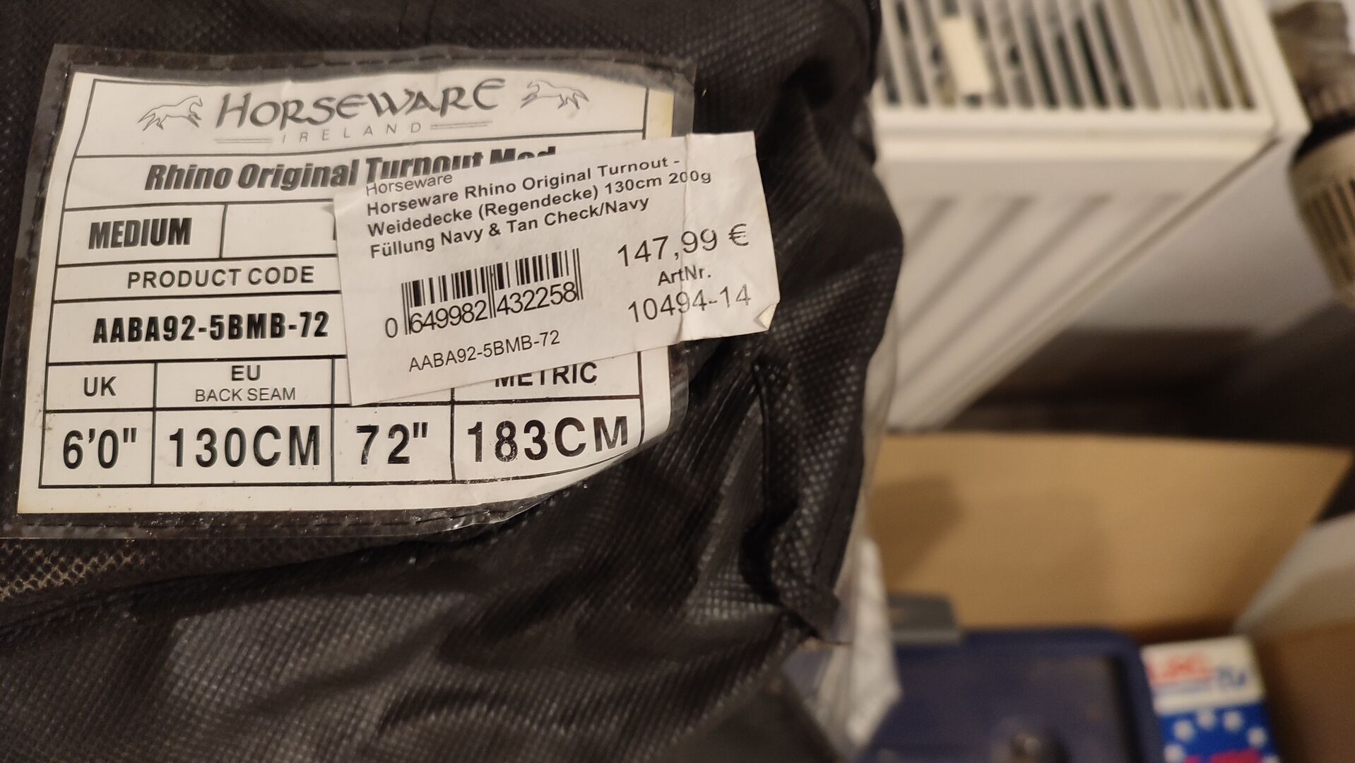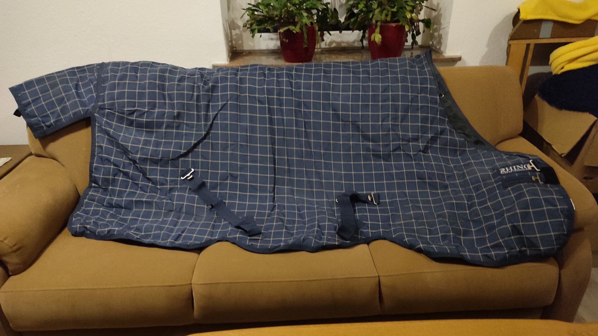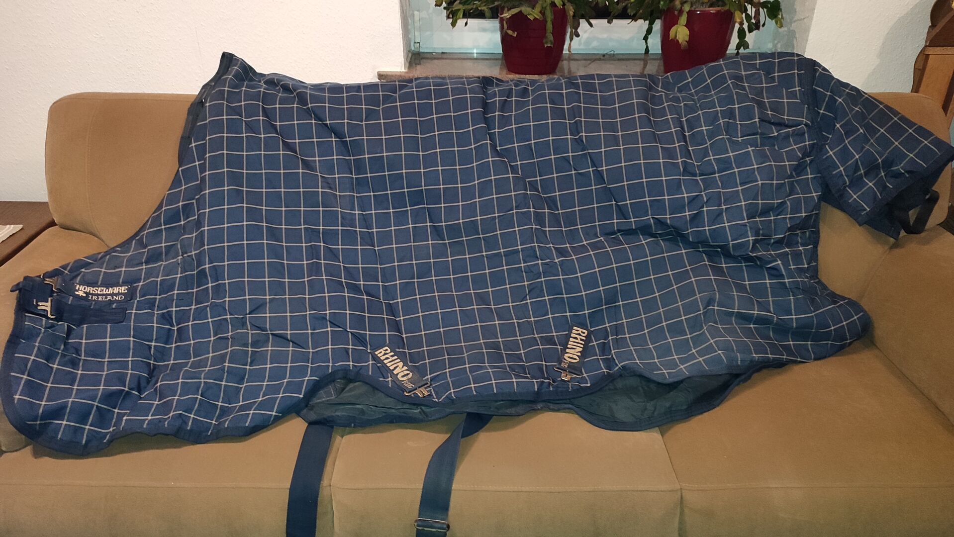 Rambo Rhino Paardendeken - Ik verkoop mijn ongeveer 1 jaar oude winterdeken van het merk Rambo Rhino. Gevoerd 200 g, maat M / 130 cm. Van buiten helemaal schoon, van binnen een beetje vies door twee keer dragen. Nieuwprijs 148€. Enkel zelf afhalen en contante betaling bij levering.