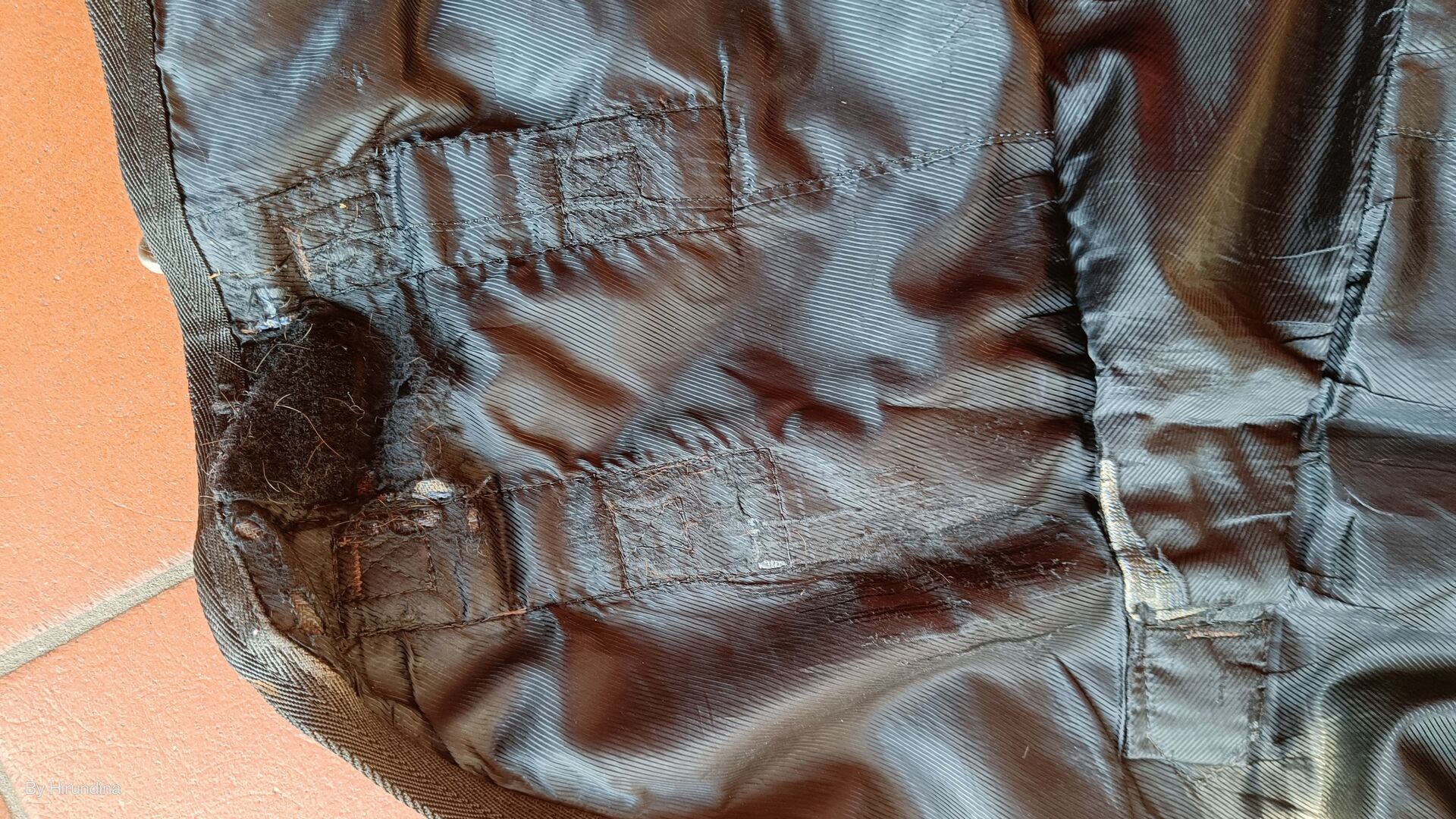 Einfache Regendecke, leichte Beschädigungen vorne innen (siehe Foto), Beschläge nach längerer Lagerung korrodiert. Funktional ansonsten in Ordnung.