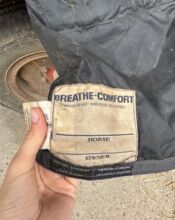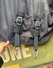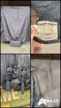 Regendeken Hoge halsdeken 165cm 0g - Hallo, ik verkoop onze outdoor Highdeck regenhoes met 0g. Hij is in de zomer geïmpregneerd en ongewassen verkocht, op de foto is hij nog een beetje nat van het dragen. De binnen- en buitenkant zijn allebei intact. Een gesp aan de voorkant is vervangen door een karabijnhaak, verder zijn alle gespen in goede staat.