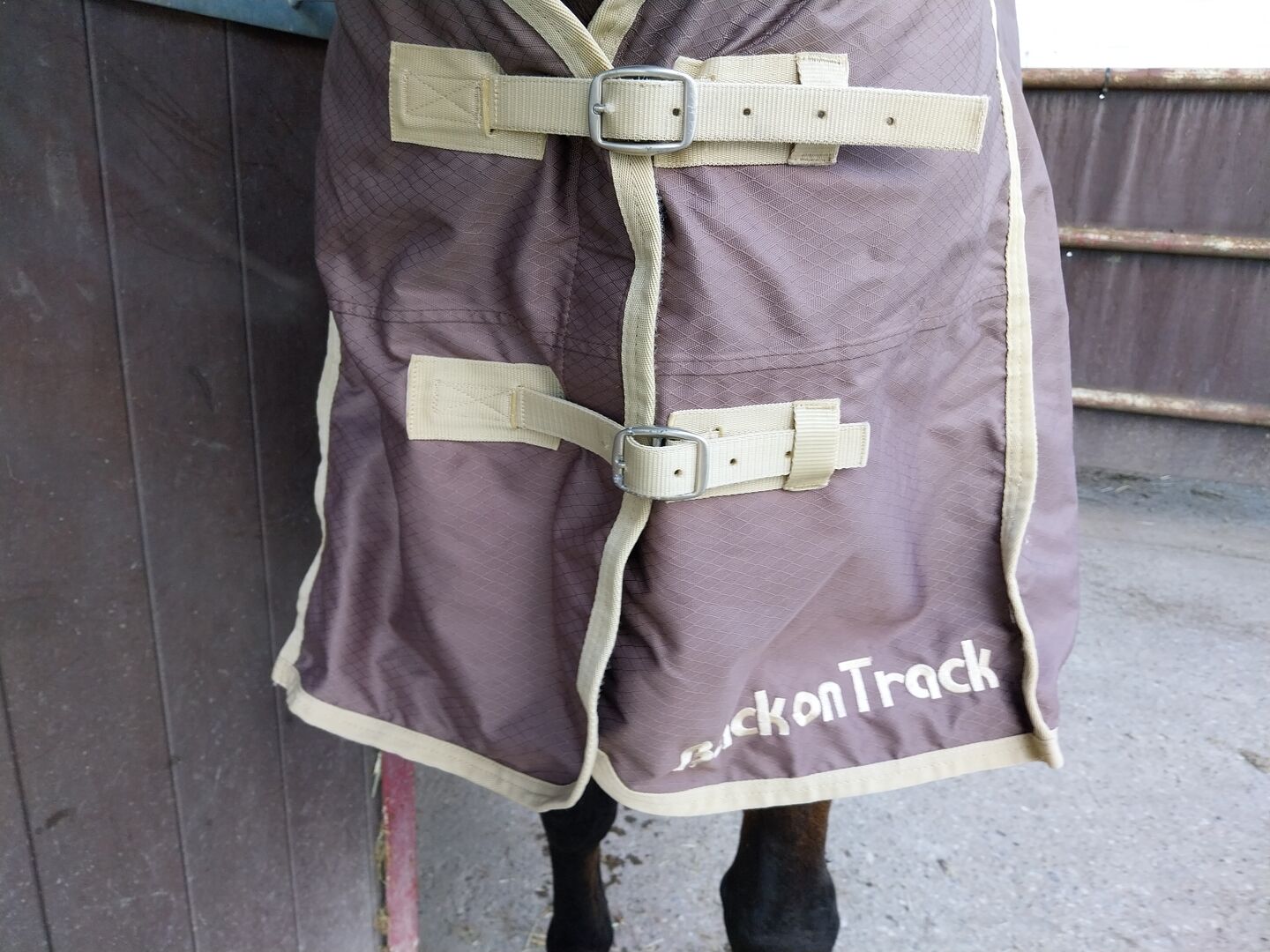 Regendeken te koop bij Back On Track - Te koop regendeken in Back on Track in 155 in bruin met 0g. De deken heeft alleen op mijn andere paard gelegen voor een proef. Hij past mijn huidige ruin niet. De deken wordt geleverd met buikriempjes die er aan beide kanten af kunnen. Alleen niet bevestigd op de foto