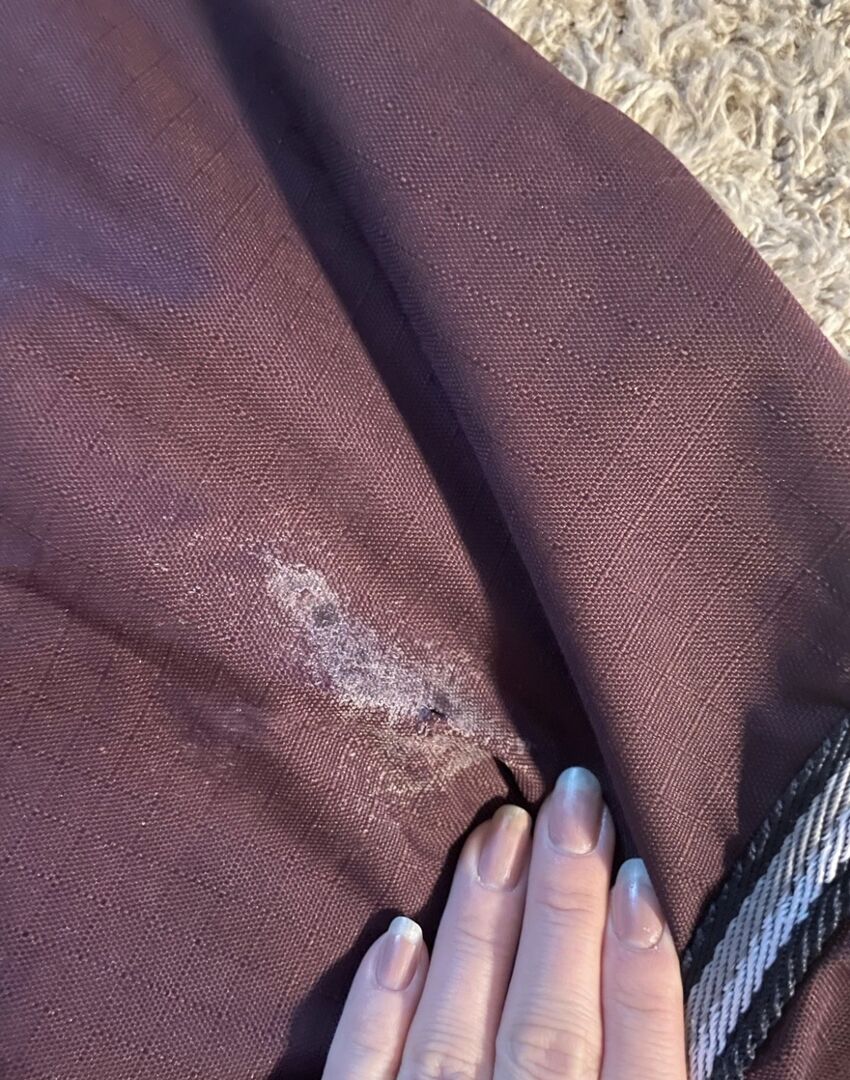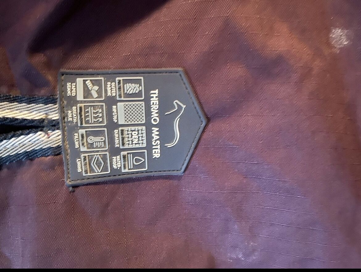 Regenhoes - Ik bied een gebruikte regendeken aan van het merk "Thermo Master" in de maat 145cm. De deken was genaaid, zie foto's, en ook op 2 plaatsen gelijmd. De lijm is door het wassen op sommige plaatsen wat uitgesmeerd.