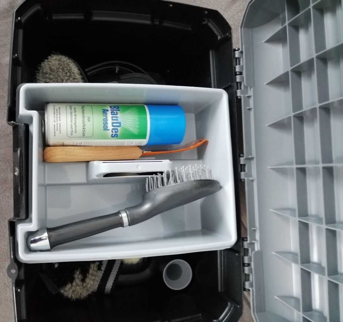 Hij bevat : Borstelhouder Uitneembaar inzetstuk voor kleine onderdelen Hard rubberen borstelkam Ring krullenkam draaibaar zomer/winterjasje Naald krullenkam Pinto stijl borstel Hoofdborstel zacht Glansborstel voor finich Extra zacht en flexibel Stofborstel zacht Wortelborstel Manenborstel Zweetmes Nieuw Hoefmes Nieuw Hoefijzer Nieuw Blauwe spray voor kleine verwondingen